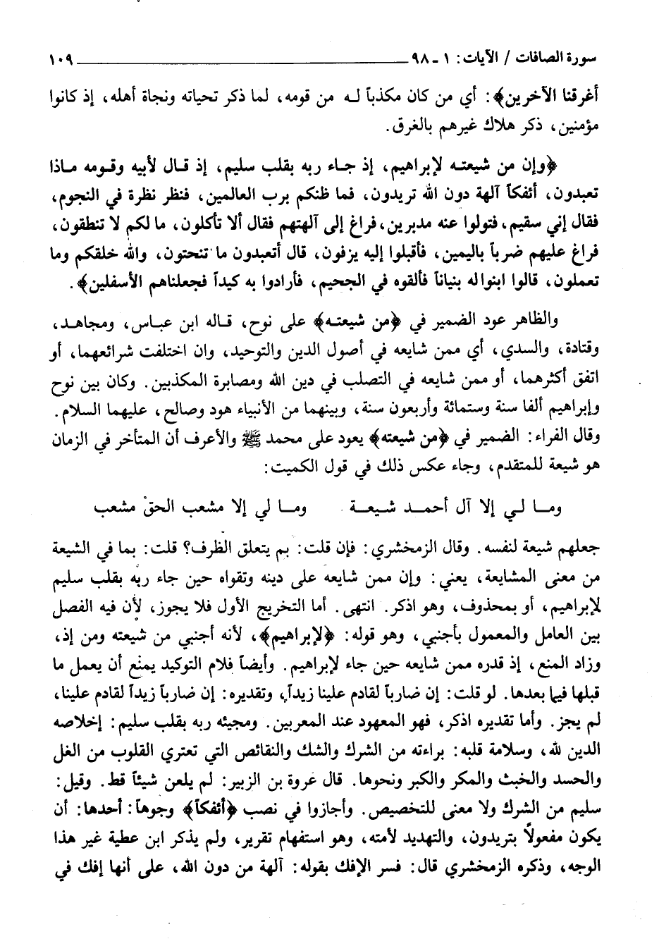 جَعَلَهُمْ شِيعَةً لِنَفْسِهِ. وَقَالَ الزَّمَخْشَرِيُّ: فَإِنْ قُلْتَ: بِمَ يَتَعَلَّقُ الظَّرْفُ؟ قُلْتُ: بِمَا فِي الشِّيعَةِ مِنْ مَعْنَى الْمُشَايَعَةِ، يَعْنِي: وَإِنَّ مِمَّنْ شَايَعَهُ عَلَى دِينِهِ وَتَقْوَاهُ حِينَ جَاءَ رَبَّهُ بِقَلْبٍ سَلِيمٍ لَإِبْرَاهِيمَ، أَوْ بِمَحْذُوفٍ، وَهُوَ اذْكُرْ. انْتَهَى. أَمَّا التَّخْرِيجُ الْأَوَّلُ فَلَا يَجُوزُ، لِأَنَّ فِيهِ الْفَصْلِ بَيْنَ الْعَامِلِ وَالْمَعْمُولِ بِأَجْنَبِيٍّ، وَهُوَ قَوْلُهُ: لَإِبْراهِيمَ، لِأَنَّهُ أَجْنَبِيٌّ مِنْ شِيعَتِهِ وَمِنْ إِذْ، وَزَادَ الْمَنْعُ، إِذْ قَدَّرَهُ مِمَّنْ شَايَعَهُ حِينَ جَاءَ لَإِبْرَاهِيمَ. وَأَيْضًا فَلَامُ التَّوْكِيدِ يَمْنَعُ أَنْ يَعْمَلَ مَا قَبْلَهَا فِيمَا بَعْدَهَا. لَوْ قُلْتَ: إن ضاربا لقادم علينا زيدا، وتقديره: إن ضَارِبًا زَيْدًا لَقَادِمٌ عَلَيْنَا، لَمْ يَجُزْ. وَأَمَّا تَقْدِيرُهُ اذْكُرْ، فَهُوَ الْمَعْهُودُ عِنْدَ الْمُعْرِبِينَ. وَمَجِيئُهُ رَبَّهُ بِقَلْبٍ سَلِيمٍ: إِخْلَاصُهُ الدِّينَ لِلَّهِ، وَسَلَامَةُ قَلْبِهِ: بَرَاءَتُهُ مِنَ الشِّرْكِ وَالشَّكِّ وَالنَّقَائِصِ الَّتِي تَعْتَرِي الْقُلُوبَ مِنَ الْغِلِّ وَالْحَسَدِ وَالْخُبْثِ وَالْمَكْرِ وَالْكِبْرِ وَنَحْوِهَا. قَالَ عُرْوَةُ بْنُ الزُّبَيْرِ: لم يلعن شَيْئًا قَطُّ. وَقِيلَ: