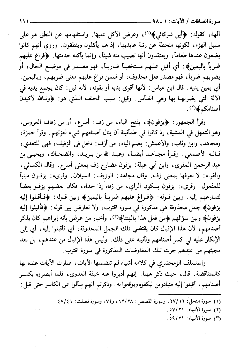 وَقَرَأَ الْجُمْهُورُ: يَزِفُّونَ، بِفَتْحِ الْيَاءِ، مِنْ زَفَّ: أَسْرَعَ، أَوْ مِنْ زِفَافِ الْعَرُوسِ، وَهُوَ التَّمَهُّلُ فِي الْمِشْيَةِ، إِذْ كَانُوا فِي طُمَأْنِينَةٍ أَنْ يَنَالَ أَصْنَامَهُمْ شَيْءٌ لِعِزَّتِهِمْ. وَقَرَأَ حَمْزَةُ، وَمُجَاهِدٌ، وَابْنُ وَثَّابٍ، وَالْأَعْمَشُ: بِضَمِّ الْيَاءِ، مِنْ أَزَفَّ: دَخَلَ فِي الزَّفِيفِ، فَهِيَ لِلتَّعَدِّي، قَالَهُ الْأَصْمَعِيُّ. وَقَرَأَ مُجَاهِدٌ أَيْضًا، وَعَبْدُ اللَّهِ بْنُ يَزِيدَ، وَالضَّحَّاكُ، وَيَحْيَى بْنُ عَبْدِ الرَّحْمَنِ الْمُقْرِيُّ، وَابْنُ أَبِي عَبْلَةَ: يَزِفُّونَ مُضَارِعُ زَفَّ بِمَعْنَى أَسْرَعَ. وَقَالَ الْكِسَائِيُّ، وَالْفَرَّاءُ: لَا نَعْرِفُهَا بِمَعْنَى زَفَّ. وَقَالَ مُجَاهِدٌ: الوزيف: السيلان. وقرىء: يزفون مبنيا للمفعول. وقرىء: يَزْفُونَ بِسُكُونِ الزَّايِ، مِنْ زَفَاهُ إِذَا حَدَاهُ، فَكَانَ بعضهم يزفو بَعْضًا لِتَسَارُعِهِمْ إِلَيْهِ. وَبَيْنَ قَوْلِهِ: فَراغَ عَلَيْهِمْ ضَرْباً بِالْيَمِينِ وَبَيْنَ قَوْلِهِ: فَأَقْبَلُوا إِلَيْهِ يَزِفُّونَ جُمَلٌ مَحْذُوفَةٌ هِيَ مَذْكُورَةٌ فِي سُورَةِ اقْتَرَبَ، وَلَا تَعَارُضَ بَيْنَ قَوْلِهِ: فَأَقْبَلُوا إِلَيْهِ يَزِفُّونَ وَبَيْنَ سُؤَالِهِمْ مَنْ فَعَلَ هَذَا بِآلِهَتِنا «3» ، وَإِخْبَارُ مَنْ عَرَضَ بِأَنَّهُ إِبْرَاهِيمُ كَانَ يَذْكُرُ أَصْنَامَهُمْ، لِأَنَّ هَذَا الْإِقْبَالَ كَانَ يَقْتَضِي تِلْكَ الْجُمَلَ الْمَحْذُوفَةَ، أَيْ فَأَقْبَلُوا إِلَيْهِ، أَيْ إِلَى الْإِنْكَارِ عَلَيْهِ فِي كَسْرِ أَصْنَامِهِمْ وَتَأْنِيبِهِ عَلَى ذَلِكَ. وَلَيْسَ هَذَا الْإِقْبَالُ مِنْ عِنْدِهِمْ، بَلْ بَعْدَ مَجِيئِهِمْ مِنْ عِنْدِهِمْ جَرَتَ تِلْكَ الْمُفَاوَضَاتُ الْمَذْكُورَةُ فِي سُورَةِ اقْتَرَبَ.
