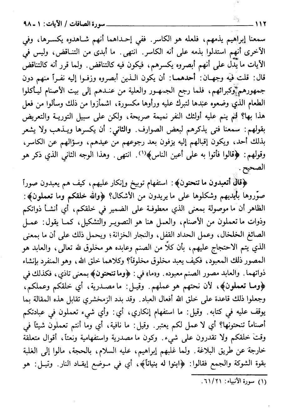 قالَ أَتَعْبُدُونَ مَا تَنْحِتُونَ: اسْتِفْهَامُ تَوْبِيخٍ وَإِنْكَارٍ عَلَيْهِمْ، كَيْفَ هُمْ يَعْبُدُونَ صِوَرًا صَوَّرُوهَا بِأَيْدِيِهِمْ وَشَكَّلُوهَا عَلَى مَا يُرِيدُونَ مِنَ الْأَشْكَالِ؟ وَاللَّهُ خَلَقَكُمْ وَما تَعْمَلُونَ: