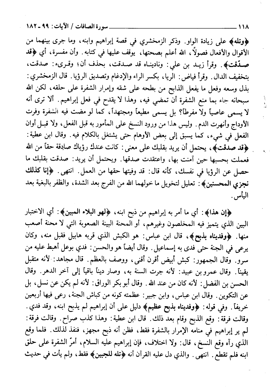 إِنَّ هَذَا: أَيْ مَا آمُرُ بِهِ إِبْرَاهِيمُ مِنْ ذَبْحِ ابْنِهِ، لَهُوَ الْبَلاءُ الْمُبِينُ: أَيِ الِاخْتِبَارُ الْبَيِّنُ الَّذِي يَتَمَيَّزُ فِيهِ الْمُخْلِصُونَ وَغَيْرُهُمْ، أَوِ الْمِحْنَةُ الْبَيِّنَةُ الصُّعُوبَةِ الَّتِي لَا مِحْنَةَ أَصْعَبُ مِنْهَا. وَفَدَيْناهُ بِذِبْحٍ، قَالَ ابْنُ عَبَّاسٍ: هُوَ الْكَبْشُ الَّذِي قَرَّبَهُ هَابِيلُ فَقُبِلَ مِنْهُ، وَكَانَ يَرْعَى فِي الْجَنَّةِ حَتَّى فُدِيَ بِهِ إِسْمَاعِيلُ. وَقَالَ أَيْضًا هُوَ وَالْحَسَنُ: فُدِيَ بِوَعْلٍ أُهْبِطَ عَلَيْهِ مِنْ سَرْوٍ. وَقَالَ الْجُمْهُورُ: كَبْشٌ أَبْيَضُ أَقْرَنُ أَقْنَى، وَوُصِفَ بِالْعِظَمِ. قَالَ مُجَاهِدٌ: لِأَنَّهُ مُتَقَبَّلٌ يَقِينًا. وَقَالَ عَمْرُو بْنُ عَبِيدٍ: لِأَنَّهُ جَرَتِ السُّنَّةُ بِهِ، وَصَارَ دِينًا بَاقِيًا إِلَى آخِرِ الدَّهْرِ. وَقَالَ الْحَسَنُ بْنُ الْفَضْلِ: لِأَنَّهُ كَانَ مِنْ عِنْدِ اللَّهِ. وَقَالَ أَبُو بَكْرٍ الْوَرَّاقُ: لِأَنَّهُ لَمْ يَكُنْ عَنْ نَسْلٍ، بَلْ عَنِ التَّكْوِينِ. وَقَالَ ابْنُ عَبَّاسٍ، وَابْنُ جُبَيْرٍ: عَظَمَتُهُ كَوْنُهُ مِنْ كِبَاشِ الْجَنَّةِ، رُعِيَ فِيهَا أَرْبَعِينَ خَرِيفًا. وَفِي قَوْلِهِ: وَفَدَيْناهُ بِذِبْحٍ عَظِيمٍ دَلِيلٌ عَلَى أَنَّ إِبْرَاهِيمَ لَمْ يَذْبَحِ ابْنَهُ، وَقَدْ فُدِيَ.