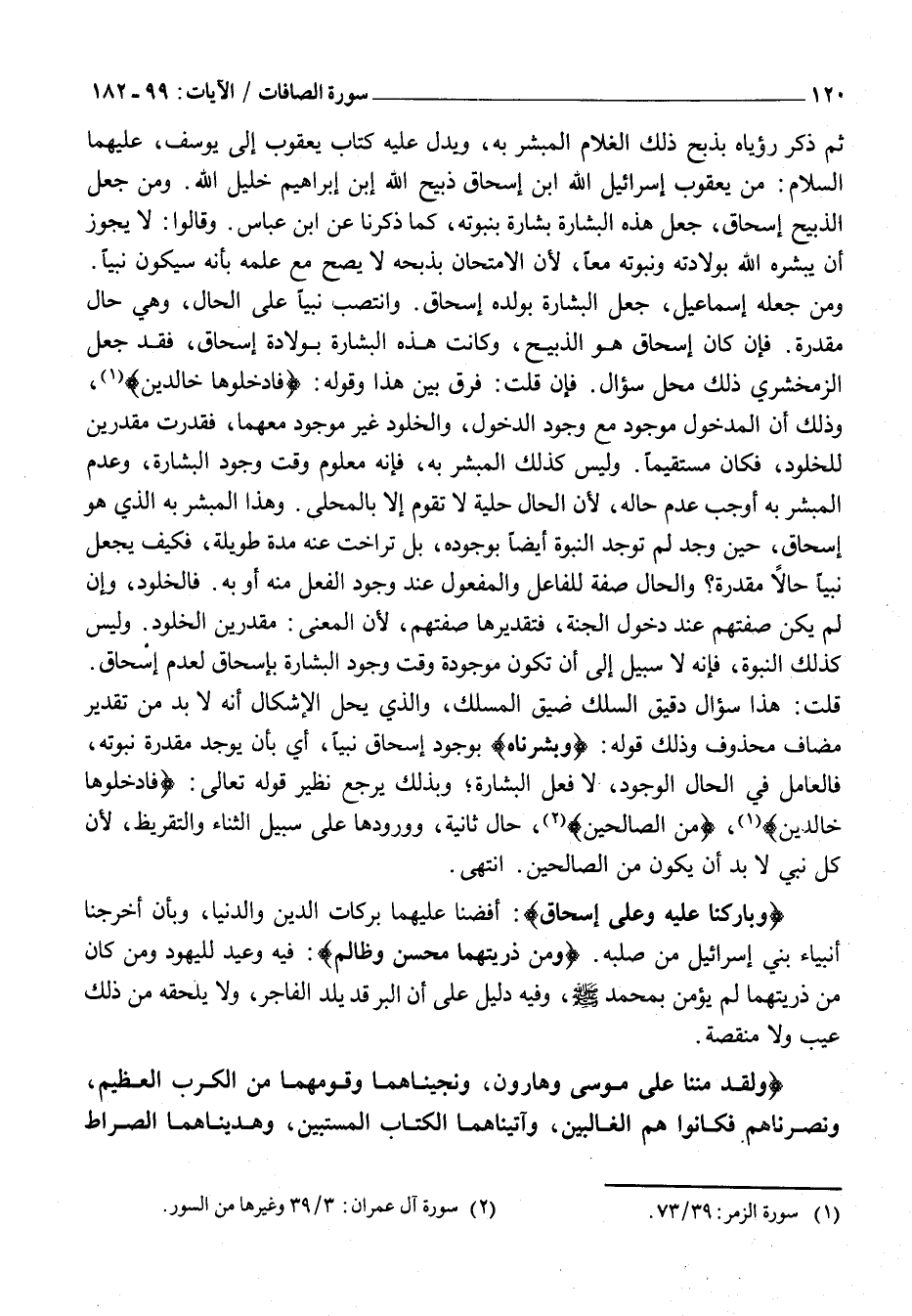 قُلْتُ: هَذَا سُؤَالٌ دَقِيقُ السَّلْكِ ضَيِّقُ الْمَسْلَكِ، وَالَّذِي يَحُلُّ الْإِشْكَالَ أَنَّهُ لَا بُدَّ مِنْ تَقْدِيرِ مُضَافٍ مَحْذُوفٍ وَذَلِكَ قَوْلُهُ: وَبَشَّرْناهُ بِوُجُودِ إِسْحَاقَ نَبِيًّا، أَيْ بِأَنْ يُوجَدَ مُقَدَّرَةً نُبُوَّتُهُ، فَالْعَامِلُ فِي الْحَالِ الْوُجُودُ، لَا فِعْلُ الْبِشَارَةِ وَبِذَلِكَ يَرْجِعُ نَظِيرُ قَوْلِهِ تَعَالَى: فَادْخُلُوها خالِدِينَ «2» ، مِنَ الصَّالِحِينَ «3» ، حَالٌ ثَانِيَةٌ، وَوُرُودُهَا عَلَى سَبِيلِ الثَّنَاءِ وَالتَّقْرِيظِ، لِأَنَّ كُلُّ نَبِيٍّ لَا بُدَّ أَنْ يَكُونَ مِنَ الصَّالِحِينَ. انْتَهَى.