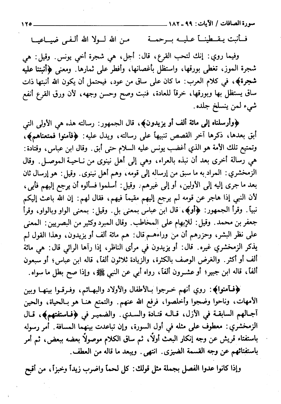 وَأَرْسَلْناهُ إِلى مِائَةِ أَلْفٍ أَوْ يَزِيدُونَ، قَالَ الْجُمْهُورُ: رِسَالَتُهُ هَذِهِ هِيَ الْأُولَى الَّتِي أَبِقَ بَعْدَهَا، ذَكَرَهَا آخِرَ الْقَصَصِ تَنْبِيهًا عَلَى رِسَالَتِهِ، وَيَدُلُّ عَلَيْهِ: فَآمَنُوا فَمَتَّعْناهُمْ، وَتَمْتِيعُ تِلْكَ الْأُمَّةِ هُوَ الَّذِي أَغْضَبَ يُونُسَ عَلَيْهِ السَّلَامُ حَتَّى أَبَقَ. وَقَالَ ابْنُ عَبَّاسٍ، وَقَتَادَةُ: