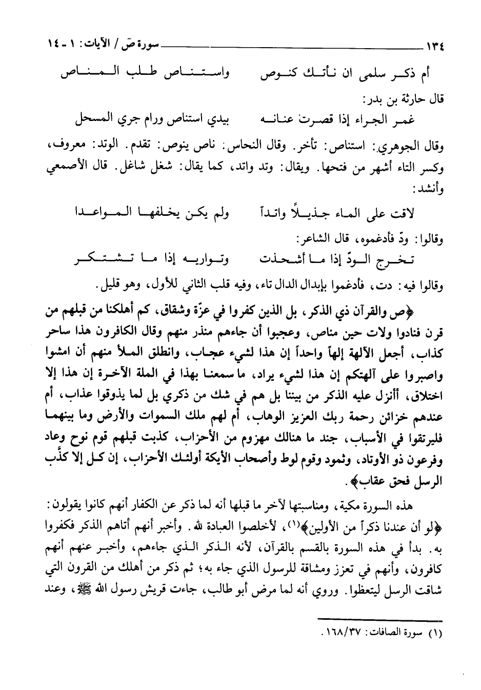 ص وَالْقُرْآنِ ذِي الذِّكْرِ، بَلِ الَّذِينَ كَفَرُوا فِي عِزَّةٍ وَشِقاقٍ، كَمْ أَهْلَكْنا مِنْ قَبْلِهِمْ مِنْ قَرْنٍ فَنادَوْا وَلاتَ حِينَ مَناصٍ، وَعَجِبُوا أَنْ جاءَهُمْ مُنْذِرٌ مِنْهُمْ وَقالَ الْكافِرُونَ هَذَا ساحِرٌ كَذَّابٌ، أَجَعَلَ الْآلِهَةَ إِلهاً واحِداً إِنَّ هَذَا لَشَيْءٌ عُجابٌ، وَانْطَلَقَ الْمَلَأُ مِنْهُمْ أَنِ امْشُوا وَاصْبِرُوا عَلى آلِهَتِكُمْ إِنَّ هَذَا لَشَيْءٌ يُرادُ، مَا سَمِعْنا بِهذا فِي الْمِلَّةِ الْآخِرَةِ إِنْ هَذَا إِلَّا اخْتِلاقٌ، أَأُنْزِلَ عَلَيْهِ الذِّكْرُ مِنْ بَيْنِنا بَلْ هُمْ فِي شَكٍّ مِنْ ذِكْرِي بَلْ لَمَّا يَذُوقُوا عَذابِ، أَمْ عِنْدَهُمْ خَزائِنُ رَحْمَةِ رَبِّكَ الْعَزِيزِ الْوَهَّابِ، أَمْ لَهُمْ مُلْكُ السَّماواتِ وَالْأَرْضِ وَما بَيْنَهُما فَلْيَرْتَقُوا فِي الْأَسْبابِ، جُنْدٌ مَا هُنالِكَ مَهْزُومٌ مِنَ الْأَحْزابِ، كَذَّبَتْ قَبْلَهُمْ قَوْمُ نُوحٍ وَعادٌ وَفِرْعَوْنُ ذُو الْأَوْتادِ، وَثَمُودُ وَقَوْمُ لُوطٍ وَأَصْحابُ الْأَيْكَةِ أُولئِكَ الْأَحْزابُ، إِنْ كُلٌّ إِلَّا كَذَّبَ الرُّسُلَ فَحَقَّ عِقابِ.