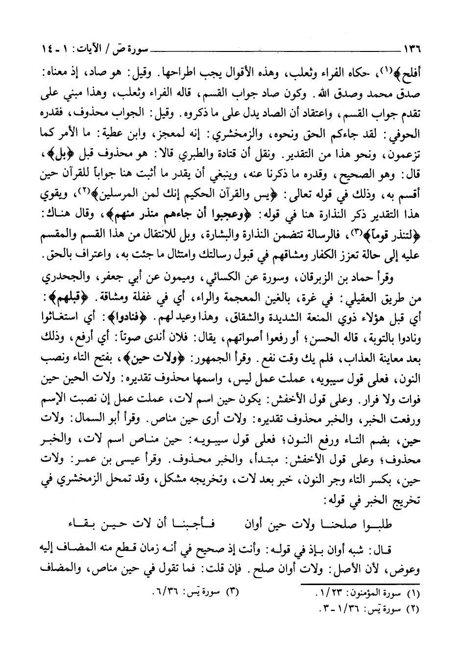 أَيْ قَبْلَ هَؤُلَاءِ ذَوِي الْمَنَعَةِ الشَّدِيدَةِ وَالشِّقَاقِ، وَهَذَا وَعِيدٌ لَهُمْ. فَنادَوْا: أَيِ اسْتَغَاثُوا وَنَادَوْا بِالتَّوْبَةِ، قَالَهُ الْحَسَنُ أَوْ رَفَعُوا أَصْوَاتَهُمْ، يُقَالُ: فُلَانٌ أَنْدَى صَوْتًا: أَيْ أَرْفَعُ، وَذَلِكَ بَعْدَ مُعَايَنَةِ الْعَذَابِ، فَلَمْ يَكُ وَقْتَ نَفْعٍ. وَقَرَأَ الْجُمْهُورُ: وَلاتَ حِينَ، بِفَتْحِ التَّاءِ وَنَصْبِ النُّونِ، فَعَلَى قَوْلِ سِيبَوَيْهِ، عَمِلَتْ عَمَلَ لَيْسَ، وَاسْمُهَا مَحْذُوفٌ تَقْدِيرُهُ: وَلَاتَ الْحِينُ حِينَ فَوَاتٍ وَلَا فِرَارٍ. وَعَلَى قَوْلِ الْأَخْفَشِ: يَكُونُ حِينَ اسْمَ لَاتَ، عَمِلَتْ عَمَلَ إِنَّ نَصَبَتِ الِاسْمَ وَرَفَعَتِ الْخَبَرَ، وَالْخَبَرُ محذوف تَقْدِيرُهُ: وَلَاتَ أَرَى حِينَ مَنَاصٍ. وَقَرَأَ أَبُو السَّمَّالِ: وَلَاتُ حِينُ، بِضَمِّ التَّاءِ وَرَفْعِ النُّونِ فَعَلَى قَوْلِ سِيبَوَيْهِ: حِينَ مَنَاصٍ اسْمُ لَاتَ، وَالْخَبَرُ مَحْذُوفٌ وَعَلَى قَوْلِ الْأَخْفَشِ: مُبْتَدَأٌ، وَالْخَبَرُ مَحْذُوفٌ. وَقَرَأَ عِيسَى بْنُ عُمَرَ: وَلَاتِ حِينِ، بِكَسْرِ التَّاءِ وَجَرِّ النُّونِ، خَبَرٌ بَعْدَ لَاتَ، وَتَخْرِيجُهُ مُشْكِلٌ، وَقَدْ تَمَحَّلَ الزَّمَخْشَرِيُّ فِي تَخْرِيجِ الْخَبَرِ فِي قَوْلِهِ: