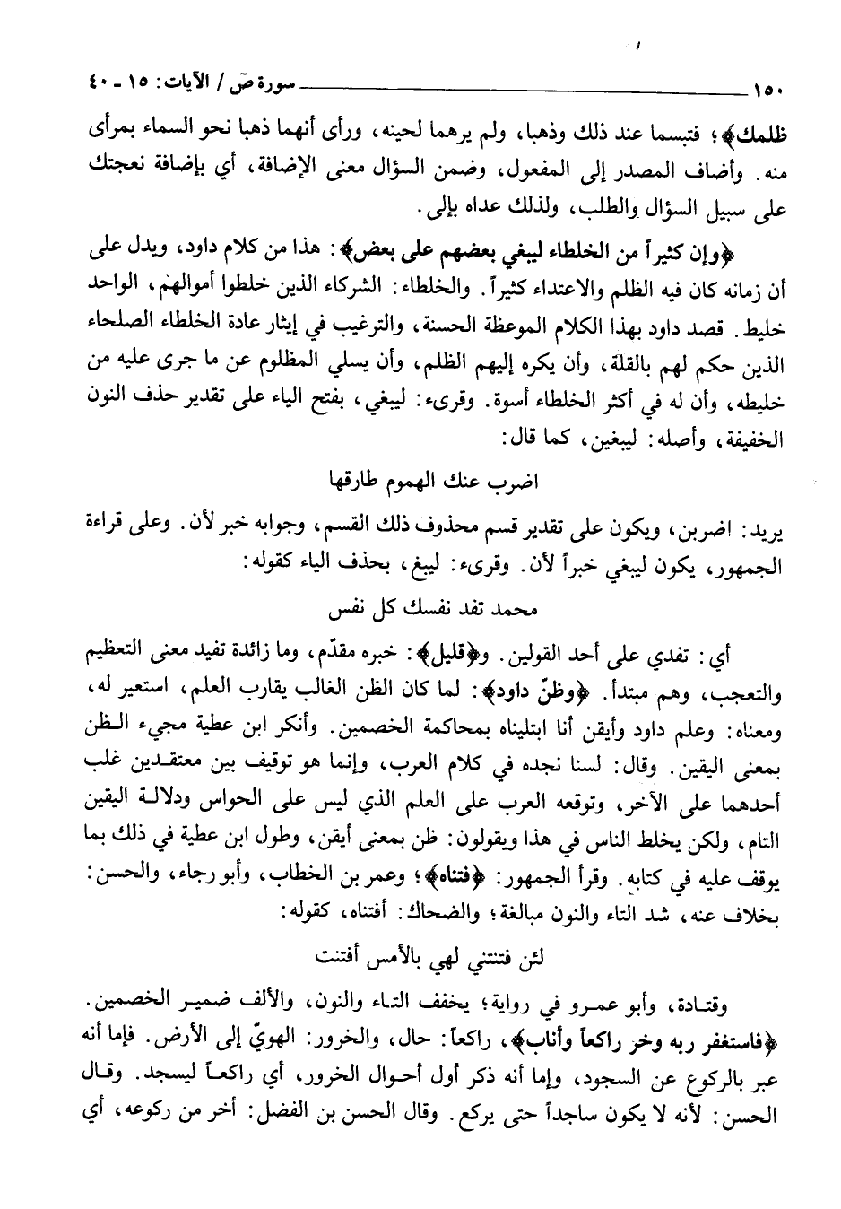 مُحَمَّدُ تَفْدِ نَفْسَكَ كُلُّ نَفْسٍ أَيْ: تَفِدِي عَلَى أحد القولين. وقَلِيلٌ: خبره مقدّم، وما زَائِدَةٌ تُفِيدُ مَعْنَى التَّعْظِيمِ وَالتَّعَجُّبِ، وَهُمْ مُبْتَدَأٌ. وَظَنَّ داوُدُ: لَمَّا كَانَ الظَّنُّ الْغَالِبُ يُقَارِبُ الْعِلْمَ، اسْتُعِيرَ لَهُ، وَمَعْنَاهُ: وَعَلِمَ دَاوُدُ وَأَيْقَنَ أَنَّا ابْتَلَيْنَاهُ بِمُحَاكَمَةِ الْخَصْمَيْنِ. وَأَنْكَرَ ابْنُ عَطِيَّةَ مَجِيءَ الظَّنِّ بِمَعْنَى الْيَقِينِ. وَقَالَ: لَسْنَا نَجِدُهُ فِي كَلَامِ الْعَرَبِ، وَإِنَّمَا هُوَ تَوْقِيفٌ بَيْنَ مُعْتَقَدَيْنِ غَلَبَ أَحَدُهُمَا عَلَى الْآخَرِ، وَتُوقِعُهُ الْعَرَبُ عَلَى الْعِلْمِ الَّذِي لَيْسَ عَلَى الْحَوَاسِّ وَدَلَالَةِ الْيَقِينِ التَّامِّ، وَلَكِنْ يَخْلِطُ النَّاسُ فِي هَذَا وَيَقُولُونَ: ظَنَّ بِمَعْنَى أَيْقَنَ، وَطَوَّلَ ابْنِ عَطِيَّةَ فِي ذَلِكَ بِمَا يُوقَفُ عَلَيْهِ فِي كِتَابِهِ. وَقَرَأَ الْجُمْهُورُ: فَتَنَّاهُ وَعُمَرُ بْنُ الْخَطَّابِ، وَأَبُو رجاء، والحسن: