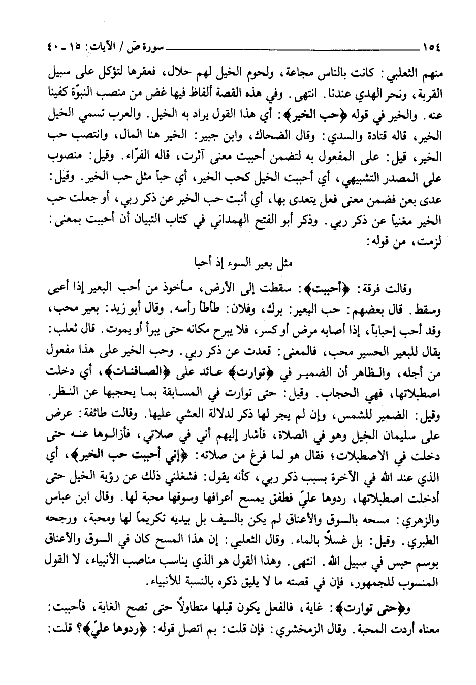 مِنْهُمُ الثَّعْلَبِيُّ: كَانَتْ بِالنَّاسِ مَجَاعَةٌ، وَلُحُومُ الْخَيْلِ لَهُمْ حَلَالٌ، فَعَقَرَهَا لِتُؤْكَلَ عَلَى سَبِيلِ الْقُرْبَةِ، وَنَحْرِ الْهَدْيِ عِنْدَنَا. انْتَهَى. وَفِي هَذِهِ الْقِصَّةِ أَلْفَاظٌ فِيهَا غَضٌّ مِنْ مَنْصِبِ النُّبُوَّةِ كَفَيْنَا عَنْهُ. وَالْخَيْرُ فِي قَوْلِهِ حُبَّ الْخَيْرِ: أَيْ هَذَا الْقَوْلُ يُرَادُ بِهِ الْخَيْلُ. وَالْعَرَبُ تُسَمِّي الْخَيْلَ الْخَيْرَ، قَالَهُ قَتَادَةُ وَالسُّدِّيُّ: وَقَالَ الضَّحَّاكُ، وَابْنُ جُبَيْرٍ: الْخَيْرُ هُنَا الْمَالُ، وَانْتَصَبَ حُبَّ الْخَيْرِ، قِيلَ: عَلَى الْمَفْعُولِ بِهِ لِتَضَمُّنِ أَحْبَبْتُ مَعْنَى آثَرْتُ، قَالَهُ الْفَرَّاءُ. وَقِيلَ: مَنْصُوبٌ عَلَى الْمَصْدَرِ التَّشْبِيهِيِّ، أَيْ أَحْبَبْتُ الْخَيْلَ كَحُبِّ الْخَيْرِ، أَيْ حُبًّا مِثْلَ حُبِّ الْخَيْرِ. وَقِيلَ: