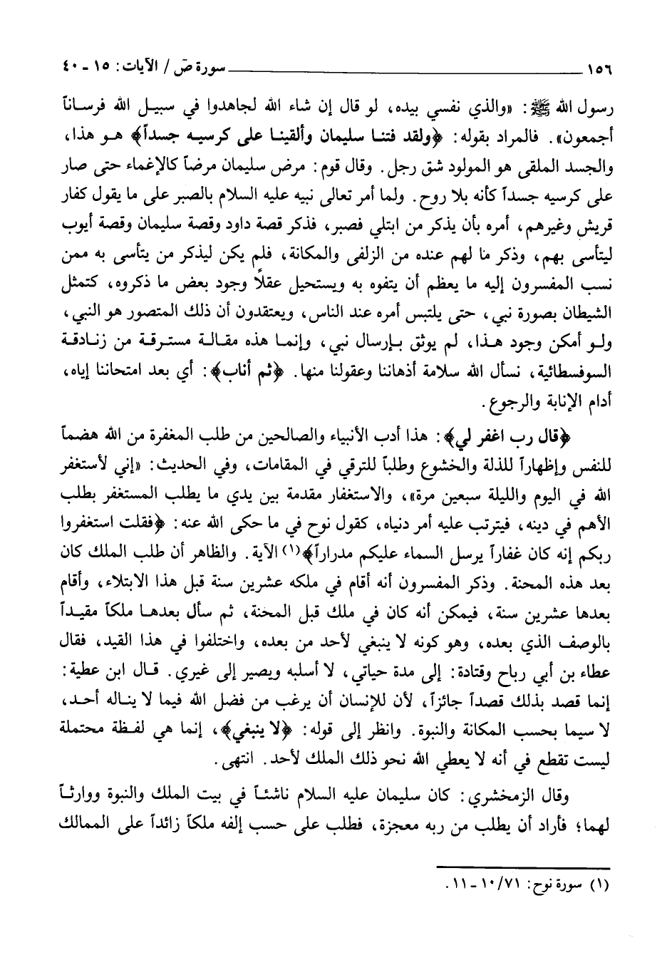 ، وَالِاسْتِغْفَارُ مُقَدِّمَةٌ بَيْنَ يَدَيْ مَا يَطْلُبُ الْمُسْتَغْفِرُ بِطَلَبِ الْأَهَمِّ فِي دِينِهِ، فَيَتَرَتَّبُ عَلَيْهِ أَمْرُ دُنْيَاهُ، كَقَوْلِ نُوحٍ فِي مَا حَكَى اللَّهُ عَنْهُ: فَقُلْتُ اسْتَغْفِرُوا رَبَّكُمْ إِنَّهُ كانَ غَفَّاراً يُرْسِلِ السَّماءَ عَلَيْكُمْ مِدْراراً «1» الْآيَةَ. وَالظَّاهِرُ أَنَّ طَلَبَ الْمُلْكِ كَانَ بَعْدَ هَذِهِ الْمِحْنَةِ. وَذَكَرَ الْمُفَسِّرُونَ أَنَّهُ أَقَامَ فِي مُلْكِهِ عِشْرِينَ سَنَةً قَبْلَ هَذَا الِابْتِلَاءِ، وَأَقَامَ بَعْدَهَا عِشْرِينَ سَنَةً، فَيُمْكِنُ أَنَّهُ كَانَ فِي مُلْكٍ قَبْلَ الْمِحْنَةِ، ثُمَّ سَأَلَ بَعْدَهَا مُلْكًا مُقَيَّدًا بِالْوَصْفِ الَّذِي بَعْدَهُ، وَهُوَ كَوْنُهُ لَا يَنْبَغِي لِأَحَدٍ مِنْ بَعْدِهِ، وَاخْتَلَفُوا فِي هَذَا الْقَيْدِ، فَقَالَ عَطَاءُ بْنُ أَبِي رَبَاحٍ وَقَتَادَةُ: إِلَى مُدَّةِ حَيَاتِي، لَا أَسْلُبُهُ ويصير إلى غيري. قَالَ ابْنُ عَطِيَّةَ: