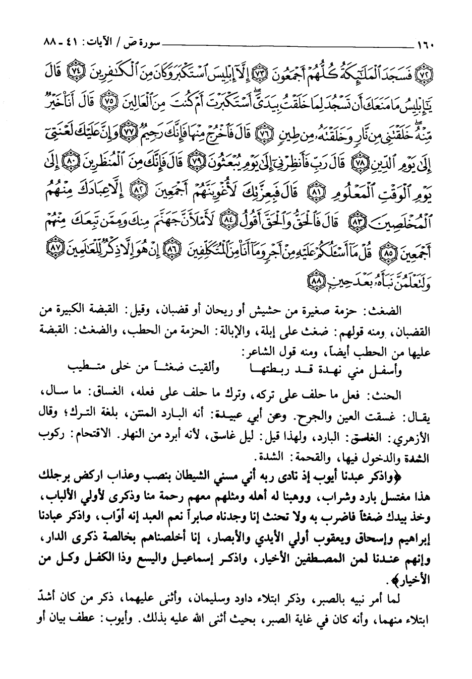 وَاذْكُرْ عَبْدَنا أَيُّوبَ إِذْ نَادَى رَبَّهُ أَنِّي مَسَّنِيَ الشَّيْطانُ بِنُصْبٍ وَعَذابٍ ارْكُضْ بِرِجْلِكَ هَذَا مُغْتَسَلٌ بارِدٌ وَشَرابٌ، وَوَهَبْنا لَهُ أَهْلَهُ وَمِثْلَهُمْ مَعَهُمْ رَحْمَةً مِنَّا وَذِكْرى لِأُولِي الْأَلْبابِ، وَخُذْ بِيَدِكَ ضِغْثاً فَاضْرِبْ بِهِ وَلا تَحْنَثْ إِنَّا وَجَدْناهُ صابِراً نِعْمَ الْعَبْدُ إِنَّهُ أَوَّابٌ، وَاذْكُرْ عِبادَنا إِبْراهِيمَ وَإِسْحاقَ وَيَعْقُوبَ أُولِي الْأَيْدِي وَالْأَبْصارِ، إِنَّا أَخْلَصْناهُمْ بِخالِصَةٍ ذِكْرَى الدَّارِ، وَإِنَّهُمْ عِنْدَنا لَمِنَ الْمُصْطَفَيْنَ الْأَخْيارِ، وَاذْكُرْ إِسْماعِيلَ وَالْيَسَعَ وَذَا الْكِفْلِ وَكُلٌّ مِنَ الْأَخْيارِ.
