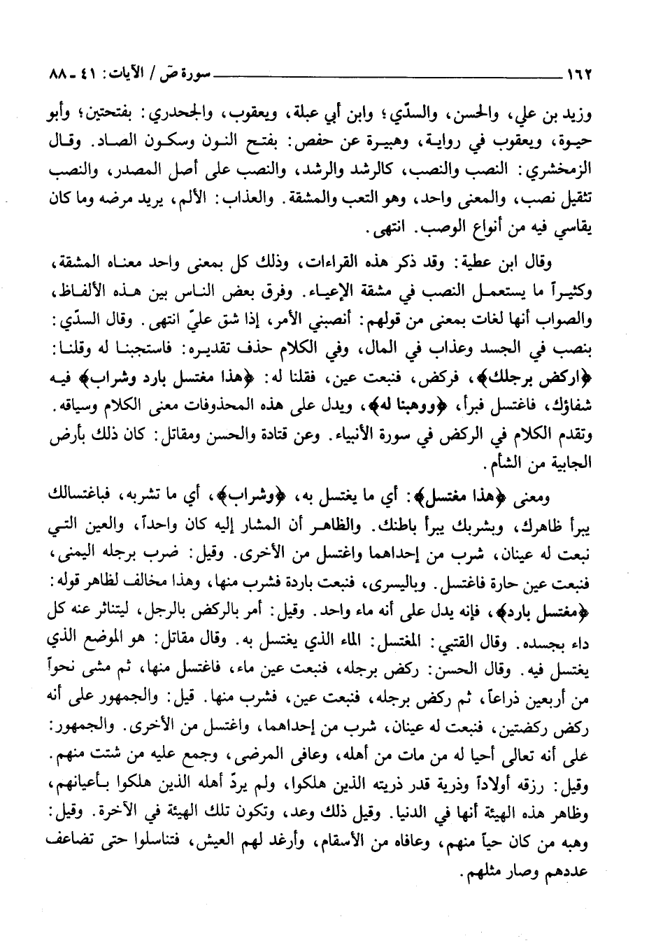 وَزَيْدُ بْنُ عَلِيٍّ، وَالْحَسَنُ، وَالسُّدِّيُّ وَابْنُ أَبِي عَبْلَةَ، وَيَعْقُوبُ، وَالْجَحْدَرِيُّ: بِفَتْحَتَيْنِ وَأَبُو حَيْوَةَ، وَيَعْقُوبُ فِي رِوَايَةٍ، وَهُبَيْرَةُ عَنْ حَفْصٍ: بِفَتْحِ النُّونِ وَسُكُونِ الصَّادِ. وَقَالَ الزَّمَخْشَرِيُّ: النُّصْبُ وَالنَّصْبُ، كَالرُّشْدِ وَالرَّشْدِ، وَالنَّصْبُ عَلَى أَصْلِ الْمَصْدَرِ، وَالنُّصْبُ تَثْقِيلُ نَصَبٍ، وَالْمَعْنَى وَاحِدٌ، وَهُوَ التَّعَبُ وَالْمَشَقَّةُ. وَالْعَذَابُ: الْأَلَمُ، يُرِيدُ مَرَضَهُ وَمَا كَانَ يُقَاسِي فِيهِ مِنْ أَنْوَاعِ الْوَصَبِ. انْتَهَى.