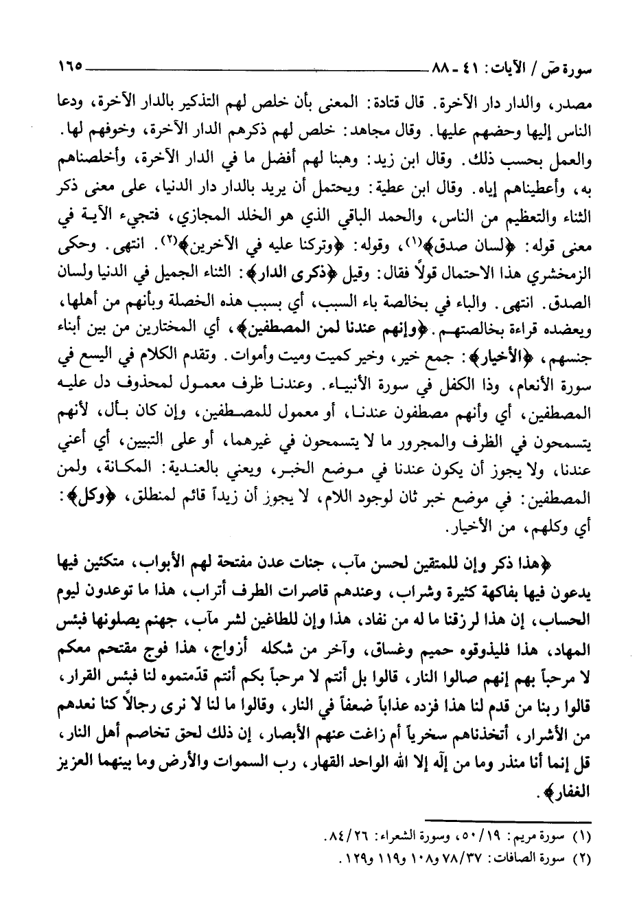 هَذَا ذِكْرٌ وَإِنَّ لِلْمُتَّقِينَ لَحُسْنَ مَآبٍ، جَنَّاتِ عَدْنٍ مُفَتَّحَةً لَهُمُ الْأَبْوابُ، مُتَّكِئِينَ فِيها يَدْعُونَ فِيها بِفاكِهَةٍ كَثِيرَةٍ وَشَرابٍ، وَعِنْدَهُمْ قاصِراتُ الطَّرْفِ أَتْرابٌ، هَذَا مَا تُوعَدُونَ لِيَوْمِ الْحِسابِ، إِنَّ هَذَا لَرِزْقُنا مَا لَهُ مِنْ نَفادٍ، هَذَا وَإِنَّ لِلطَّاغِينَ لَشَرَّ مَآبٍ، جَهَنَّمَ يَصْلَوْنَها فَبِئْسَ الْمِهادُ، هَذَا فَلْيَذُوقُوهُ حَمِيمٌ وَغَسَّاقٌ، وَآخَرُ مِنْ شَكْلِهِ أَزْواجٌ، هَذَا فَوْجٌ مُقْتَحِمٌ مَعَكُمْ لَا مَرْحَباً بِهِمْ إِنَّهُمْ صالُوا النَّارِ، قالُوا بَلْ أَنْتُمْ لَا مَرْحَباً بِكُمْ أَنْتُمْ قَدَّمْتُمُوهُ لَنا فَبِئْسَ الْقَرارُ، قالُوا رَبَّنا مَنْ قَدَّمَ لَنا هَذَا فَزِدْهُ عَذاباً ضِعْفاً فِي النَّارِ، وَقالُوا مَا لَنا لَا نَرى رِجالًا كُنَّا نَعُدُّهُمْ مِنَ الْأَشْرارِ، أَتَّخَذْناهُمْ سِخْرِيًّا أَمْ زاغَتْ عَنْهُمُ الْأَبْصارُ، إِنَّ ذلِكَ لَحَقٌّ تَخاصُمُ أَهْلِ النَّارِ، قُلْ إِنَّما أَنَا مُنْذِرٌ وَما مِنْ إِلهٍ إِلَّا اللَّهُ الْواحِدُ الْقَهَّارُ، رَبُّ السَّماواتِ وَالْأَرْضِ وَما بَيْنَهُمَا الْعَزِيزُ الْغَفَّارُ.