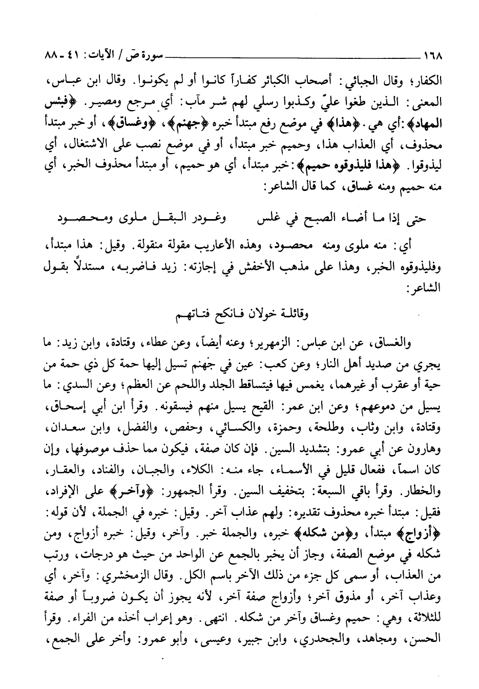 وَقَائِلَةٍ خَوْلَانُ فَانْكِحْ فتاتهم وَالْغَسَّاقُ، عَنِ ابْنِ عَبَّاسٍ: الزَّمْهَرِيرُ وَعَنْهُ أَيْضًا، وَعَنْ عَطَاءٍ، وَقَتَادَةَ، وَابْنِ زَيْدٍ: مَا يَجْرِي مِنْ صَدِيدِ أَهْلِ النَّارِ وَعَنْ كَعْبٍ: عَيْنٌ فِي جَهَنَّمَ تَسِيلُ إِلَيْهَا حُمَةُ كُلِّ ذِي حُمَةٍ مِنْ حَيَّةٍ أَوْ عَقْرَبٍ أَوْ غَيْرِهِمَا، يُغْمَسُ فِيهَا فَيَتَسَاقَطُ الْجِلْدُ وَاللَّحْمُ عَنِ الْعَظْمِ وَعَنِ السُّدِّيِّ: مَا يَسِيلُ مِنْ دُمُوعِهِمْ وَعَنِ ابْنِ عُمَرَ: الْقَيْحُ يَسِيلُ مِنْهُمْ فَيُسْقَوْنَهُ. وَقَرَأَ ابْنُ أَبِي إِسْحَاقَ، وَقَتَادَةُ، وَابْنُ وَثَّابٍ، وَطَلْحَةُ، وَحَمْزَةُ، وَالْكِسَائِيُّ، وَحَفْصٌ، وَالْفَضْلُ، وَابْنُ سَعْدَانَ، وَهَارُونَ عَنْ أَبِي عَمْرٍو: بِتَشْدِيدِ السِّينِ. فَإِنْ كَانَ صِفَةً، فَيَكُونُ مِمَّا حُذِفَ مَوْصُوفُهَا، وَإِنْ كَانَ اسْمًا، فَفَعَّالٌ قَلِيلٌ فِي الْأَسْمَاءِ، جَاءَ مِنْهُ: الْكَلَّاءُ، وَالْجَبَّانُ، وَالْفَنَّادُ، وَالْعَقَّارُ، وَالْخَطَّارُ. وَقَرَأَ بَاقِي السَّبْعَةِ: بِتَخْفِيفِ السِّينِ. وَقَرَأَ الْجُمْهُورُ: وَآخَرُ عَلَى الْإِفْرَادِ، فَقِيلَ: مُبْتَدَأٌ خَبَرُهُ مَحْذُوفٌ تَقْدِيرُهُ: وَلَهُمْ عَذَابٌ آخَرُ. وَقِيلَ: خَبَرُهُ فِي الْجُمْلَةِ، لِأَنَّ قَوْلَهُ: