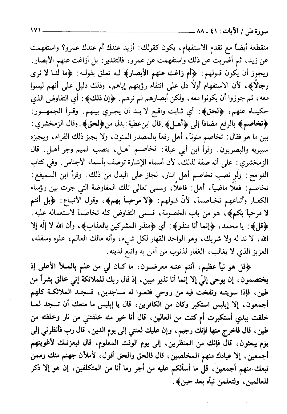 قُلْ هُوَ نَبَأٌ عَظِيمٌ، أَنْتُمْ عَنْهُ مُعْرِضُونَ، مَا كانَ لِي مِنْ عِلْمٍ بِالْمَلَإِ الْأَعْلى إِذْ يَخْتَصِمُونَ، إِنْ يُوحى إِلَيَّ إِلَّا أَنَّما أَنَا نَذِيرٌ مُبِينٌ، إِذْ قالَ رَبُّكَ لِلْمَلائِكَةِ إِنِّي خالِقٌ بَشَراً مِنْ طِينٍ، فَإِذا سَوَّيْتُهُ وَنَفَخْتُ فِيهِ مِنْ رُوحِي فَقَعُوا لَهُ ساجِدِينَ، فَسَجَدَ الْمَلائِكَةُ كُلُّهُمْ أَجْمَعُونَ، إِلَّا إِبْلِيسَ اسْتَكْبَرَ وَكانَ مِنَ الْكافِرِينَ، قالَ يَا إِبْلِيسُ مَا مَنَعَكَ أَنْ تَسْجُدَ لِما خَلَقْتُ بِيَدَيَّ أَسْتَكْبَرْتَ أَمْ كُنْتَ مِنَ الْعالِينَ، قالَ أَنَا خَيْرٌ مِنْهُ خَلَقْتَنِي مِنْ نارٍ وَخَلَقْتَهُ مِنْ طِينٍ، قالَ فَاخْرُجْ مِنْها فَإِنَّكَ رَجِيمٌ، وَإِنَّ عَلَيْكَ لَعْنَتِي إِلى يَوْمِ الدِّينِ، قالَ رَبِّ فَأَنْظِرْنِي إِلى يَوْمِ يُبْعَثُونَ، قالَ فَإِنَّكَ مِنَ الْمُنْظَرِينَ، إِلى يَوْمِ الْوَقْتِ الْمَعْلُومِ، قالَ فَبِعِزَّتِكَ لَأُغْوِيَنَّهُمْ أَجْمَعِينَ، إِلَّا عِبادَكَ مِنْهُمُ الْمُخْلَصِينَ، قالَ فَالْحَقُّ وَالْحَقَّ أَقُولُ، لَأَمْلَأَنَّ جَهَنَّمَ مِنْكَ وَمِمَّنْ تَبِعَكَ مِنْهُمْ أَجْمَعِينَ، قُلْ مَا أَسْئَلُكُمْ عَلَيْهِ مِنْ أَجْرٍ وَما أَنَا مِنَ الْمُتَكَلِّفِينَ، إِنْ هُوَ إِلَّا ذِكْرٌ لِلْعالَمِينَ، وَلَتَعْلَمُنَّ نَبَأَهُ بَعْدَ حِينٍ.
