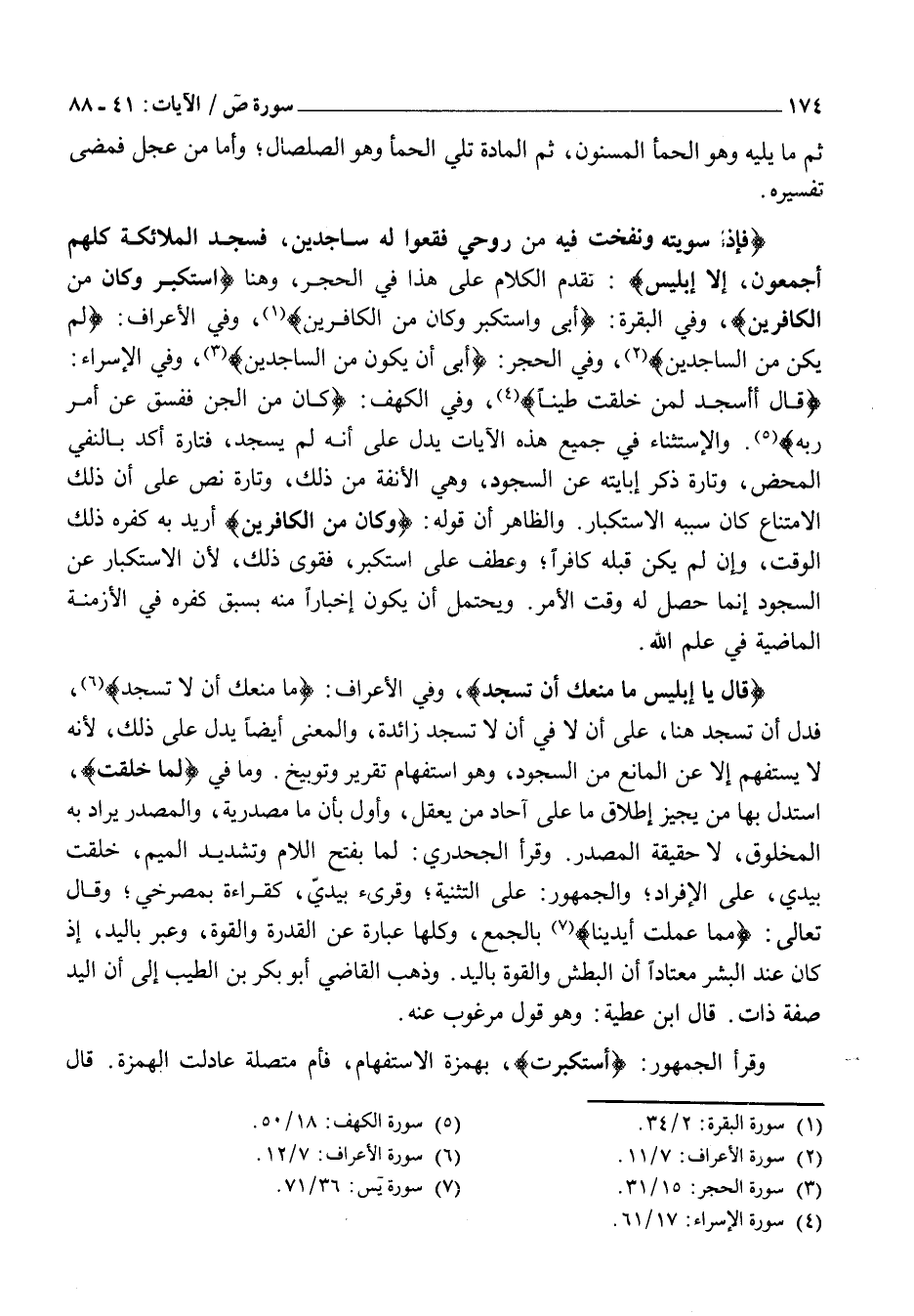 قالَ أَأَسْجُدُ لِمَنْ خَلَقْتَ طِيناً «4» ، وَفِي الْكَهْفِ: كانَ مِنَ الْجِنِّ فَفَسَقَ عَنْ أَمْرِ رَبِّهِ «5» . وَالِاسْتِثْنَاءُ فِي جَمِيعِ هَذِهِ الْآيَاتِ يَدُلُّ عَلَى أَنَّهُ لَمْ يَسْجُدْ، فَتَارَةً أَكَّدَ بِالنَّفْيِّ الْمَحْضِ، وَتَارَةً ذَكَرَ إِبَايَتَهُ عَنِ السُّجُودِ، وَهِيَ الْأَنَفَةُ مِنْ ذَلِكَ، وَتَارَةً نَصَّ عَلَى أَنَّ ذَلِكَ الِامْتِنَاعَ كَانَ سَبَبُهُ الِاسْتِكْبَارَ. وَالظَّاهِرُ أَنَّ قَوْلَهُ: وَكانَ مِنَ الْكافِرِينَ أُرِيدَ بِهِ كُفْرُهُ ذلك الوقت، وإن لم يَكُنْ قَبْلَهُ كَافِرًا وَعُطِفَ عَلَى اسْتَكْبَرَ، فَقَوِيَ ذَلِكَ، لِأَنَّ الِاسْتِكْبَارَ عَنِ السُّجُودِ إِنَّمَا حَصَلَ لَهُ وَقْتَ الْأَمْرُ. وَيُحْتَمَلُ أَنْ يَكُونَ إِخْبَارًا مِنْهُ بِسَبْقِ كُفْرِهِ فِي الْأَزْمِنَةِ الْمَاضِيَةِ فِي عِلْمِ اللَّهِ.