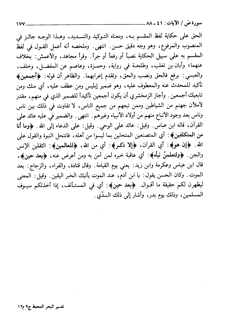 الْحَقَّ عَلَى حِكَايَةِ لَفْظِ الْمُقْسَمَ بِهِ، وَمَعْنَاهُ التَّوْكِيدُ وَالتَّسْدِيدُ، وَهَذَا الْوَجْهُ جَائِزٌ فِي الْمَنْصُوبِ وَالْمَرْفُوعِ، وَهُوَ وَجْهٌ دَقِيقٌ حَسَنٌ. انْتَهَى. وَمُلَخَّصُهُ أَنَّهُ أَعْمَلَ الْقَوْلَ فِي لَفْظِ الْمُقْسَمِ بِهِ عَلَى سَبِيلِ الْحِكَايَةِ نَصْبًا أَوْ رَفْعًا أَوْ جَرًّا. وَقَرَأَ مُجَاهِدٌ، وَالْأَعْمَشُ: بِخِلَافٍ عَنْهُمَا وَأَبَانُ بْنُ تَغْلَبَ، وَطَلْحَةُ فِي رِوَايَةٍ، وَحَمْزَةُ، وَعَاصِمٌ عَنِ الْمُفَضَّلِ، وَخَلَفٍ، وَالْعَبْسِيِّ: بِرَفْعِ فَالْحَقُّ وَنَصْبِ وَالْحَقَّ، وَتَقَدَّمَ إِعْرَابُهُمَا. وَالظَّاهِرُ أَنَّ قَوْلَهُ: أَجْمَعِينَ تَأْكِيدٌ لِلْمُحَدَّثِ عَنْهُ وَالْمَعْطُوفُ عَلَيْهِ، وَهُوَ ضَمِيرُ إِبْلِيسَ وَمَنْ عُطِفَ عَلَيْهِ، أَيْ مِنْكَ وَمِنْ تَابِعِيكِ أَجْمَعِينَ. وَأَجَازَ الزَّمَخْشَرِيُّ أَنْ يَكُونَ أَجْمَعِينَ تَأْكِيدًا لِلضَّمِيرِ الَّذِي فِي مِنْهُمْ، مُقَدَّرٌ لَأَمْلَأَنَّ جَهَنَّمَ مِنَ الشَّيَاطِينِ وَمِمَّنْ تَبِعَهُمْ مِنْ جَمِيعِ النَّاسِ، لَا تَفَاوُتَ فِي ذَلِكَ بَيْنَ نَاسٍ وَنَاسٍ بَعْدَ وُجُودِ الْأَتْبَاعِ مِنْهُمْ مِنْ أَوْلَادِ الْأَنْبِيَاءِ وَغَيْرِهِمْ. انْتَهَى. وَالضَّمِيرُ فِي عَلَيْهِ عَائِدٌ عَلَى الْقُرْآنُ، قَالَهُ ابْنُ عَبَّاسٍ. وَقِيلَ: عَائِدٌ عَلَى الْوَحْيِ. وَقِيلَ: عَلَى الدُّعَاءِ إِلَى اللَّهِ. وَما أَنَا مِنَ الْمُتَكَلِّفِينَ: أَيِ الْمُتَصَنِّعِينَ الْمُتَحَلِّينَ بِمَا لَيْسُوا مِنْ أَهْلِهِ، فَأَنْتَحَلُ النُّبُوَّةَ وَالْقَوْلَ عَلَى اللَّهِ. إِنْ هُوَ: أَيِ الْقُرْآنُ، إِلَّا ذِكْرٌ: أَيْ مِنَ اللَّهِ، لِلْعالَمِينَ: الثَّقَلَيْنِ الْإِنْسِ وَالْجِنِّ. وَلَتَعْلَمُنَّ نَبَأَهُ: أَيْ عَاقِبَةَ خَبَرِهِ لِمَنْ آمَنَ بِهِ وَمَنْ أَعْرَضَ عَنْهُ، بَعْدَ حِينٍ، قَالَ ابْنُ عَبَّاسٍ وَعِكْرِمَةُ وَابْنُ زَيْدٍ: يَعْنِي يَوْمَ الْقِيَامَةِ. وَقَالَ قَتَادَةُ، وَالْفَرَّاءُ، وَالزَّجَّاجُ: بَعْدَ الْمَوْتِ. وَكَانَ الْحَسَنُ يَقُولُ: يَا ابْنَ آدَمَ، عِنْدَ الْمَوْتِ يَأْتِيكَ الْخَبَرُ الْيَقِينُ. وَقِيلَ: الْمَعْنَى لَيَظْهَرَنَّ لكم حقيقة ما أقوال. بَعْدَ حِينٍ: أَيْ فِي الْمُسْتَأْنَفِ، إِذَا أَخَذَتْكُمْ سُيُوفُ الْمُسْلِمِينَ، وَذَلِكَ يَوْمَ بَدْرٍ، وَأَشَارَ إِلَى ذَلِكَ السُّدِّيُّ.