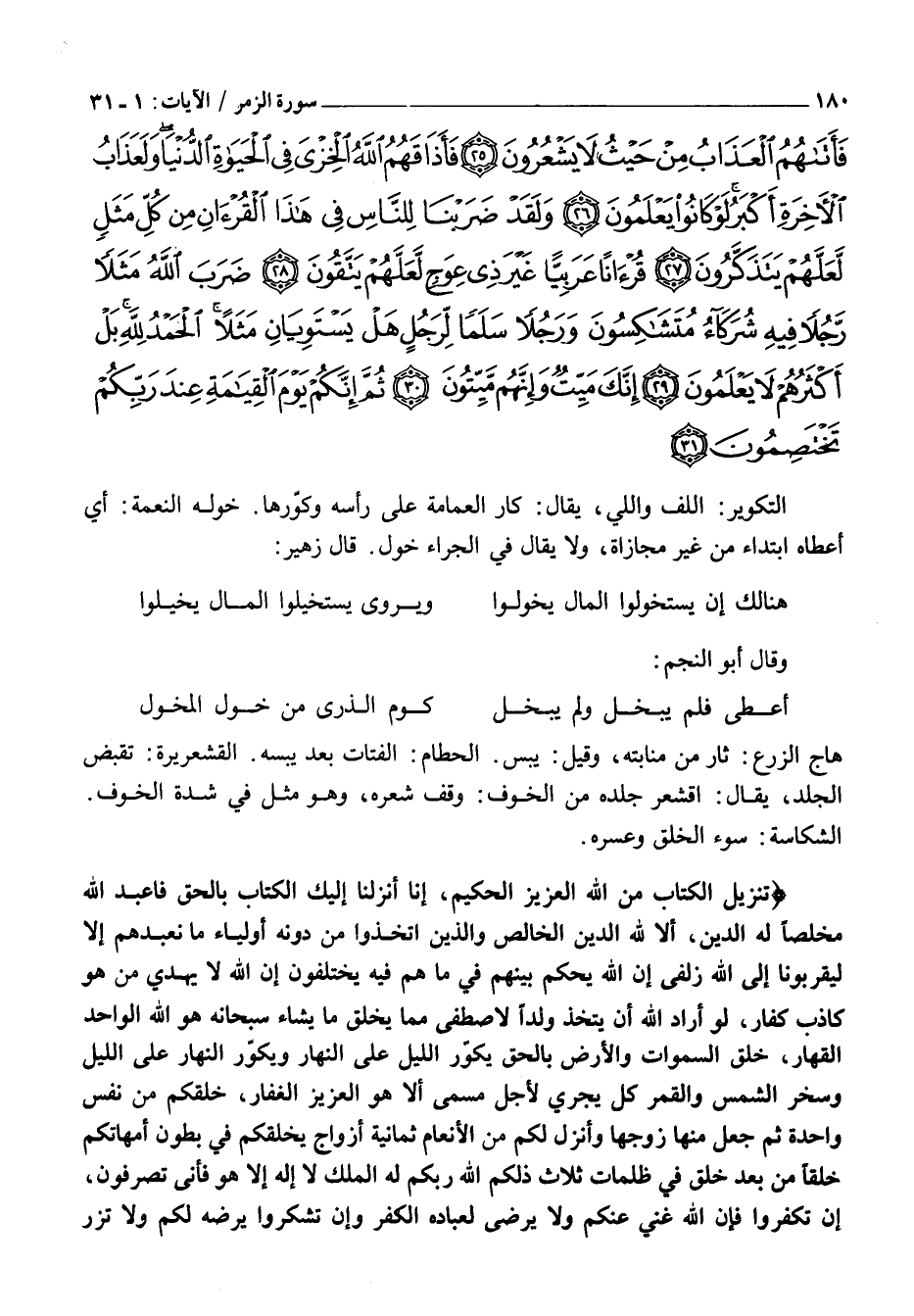 تَنْزِيلُ الْكِتابِ مِنَ اللَّهِ الْعَزِيزِ الْحَكِيمِ، إِنَّا أَنْزَلْنا إِلَيْكَ الْكِتابَ بِالْحَقِّ فَاعْبُدِ اللَّهَ مُخْلِصاً لَهُ الدِّينَ، أَلا لِلَّهِ الدِّينُ الْخالِصُ وَالَّذِينَ اتَّخَذُوا مِنْ دُونِهِ أَوْلِياءَ مَا نَعْبُدُهُمْ إِلَّا لِيُقَرِّبُونا إِلَى اللَّهِ زُلْفى إِنَّ اللَّهَ يَحْكُمُ بَيْنَهُمْ فِي مَا هُمْ فِيهِ يَخْتَلِفُونَ إِنَّ اللَّهَ لَا يَهْدِي مَنْ هُوَ كاذِبٌ كَفَّارٌ، لَوْ أَرادَ اللَّهُ أَنْ يَتَّخِذَ وَلَداً لَاصْطَفى مِمَّا يَخْلُقُ مَا يَشاءُ سُبْحانَهُ هُوَ اللَّهُ الْواحِدُ الْقَهَّارُ، خَلَقَ السَّماواتِ وَالْأَرْضَ بِالْحَقِّ يُكَوِّرُ اللَّيْلَ عَلَى النَّهارِ وَيُكَوِّرُ النَّهارَ عَلَى اللَّيْلِ وَسَخَّرَ الشَّمْسَ وَالْقَمَرَ كُلٌّ يَجْرِي لِأَجَلٍ مُسَمًّى أَلا هُوَ الْعَزِيزُ الْغَفَّارُ، خَلَقَكُمْ مِنْ نَفْسٍ واحِدَةٍ ثُمَّ جَعَلَ مِنْها زَوْجَها وَأَنْزَلَ لَكُمْ مِنَ الْأَنْعامِ ثَمانِيَةَ أَزْواجٍ يَخْلُقُكُمْ فِي بُطُونِ أُمَّهاتِكُمْ خَلْقاً مِنْ بَعْدِ خَلْقٍ فِي ظُلُماتٍ ثَلاثٍ ذلِكُمُ اللَّهُ رَبُّكُمْ لَهُ الْمُلْكُ لَا إِلهَ إِلَّا هُوَ فَأَنَّى تُصْرَفُونَ، إِنْ تَكْفُرُوا فَإِنَّ اللَّهَ غَنِيٌّ عَنْكُمْ وَلا يَرْضى لِعِبادِهِ الْكُفْرَ وَإِنْ تَشْكُرُوا يَرْضَهُ لَكُمْ وَلا تَزِرُ