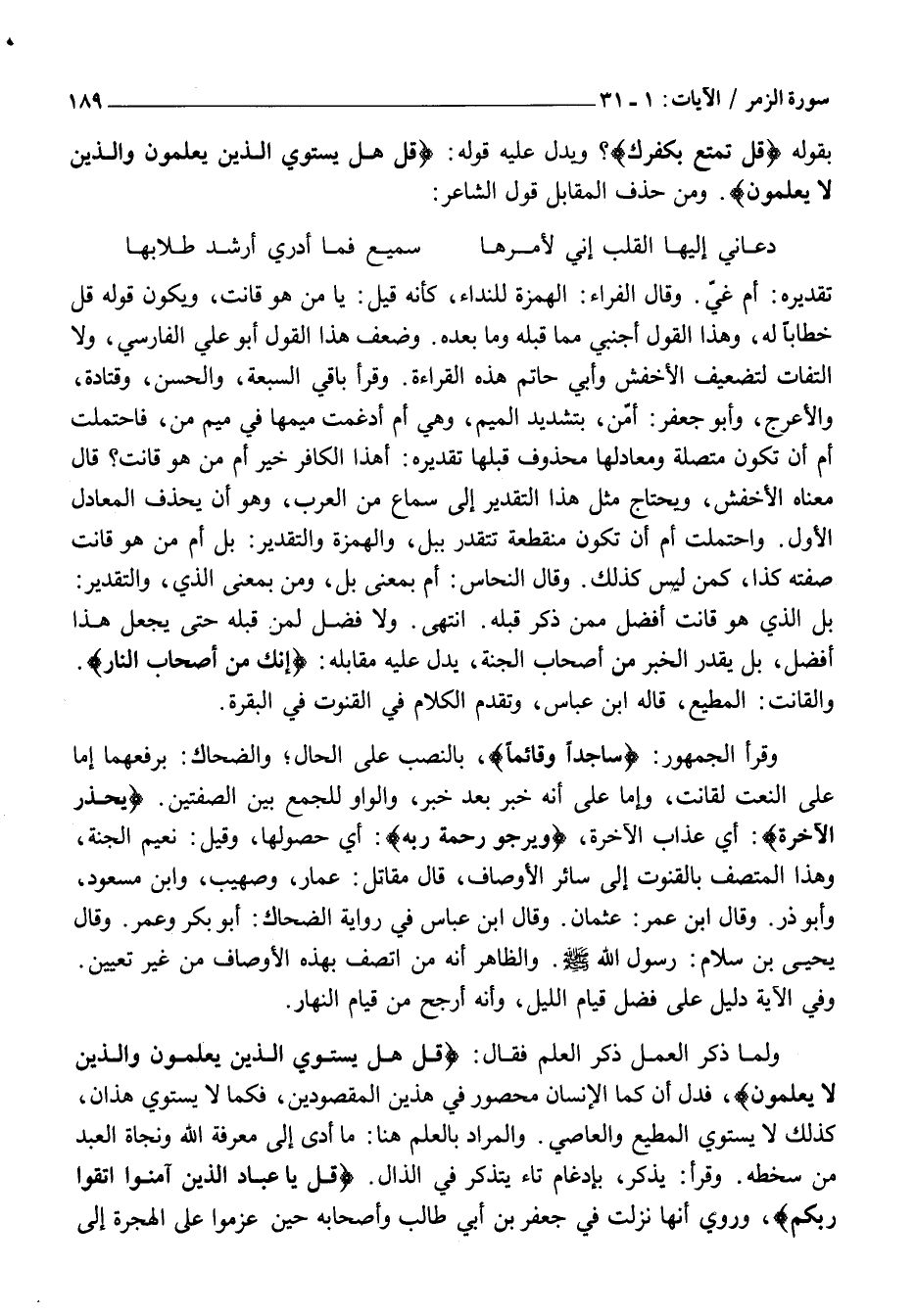 وَلَمَّا ذَكَرَ الْعَمَلَ ذَكَرَ الْعِلْمَ فَقَالَ: قُلْ هَلْ يَسْتَوِي الَّذِينَ يَعْلَمُونَ وَالَّذِينَ لَا يَعْلَمُونَ، فَدَلَّ أن كما الْإِنْسَانِ مَحْصُورٌ فِي هَذَيْنِ الْمَقْصُودَيْنِ، فَكَمَا لَا يَسْتَوِي هَذَانِ، كَذَلِكَ لَا يَسْتَوِي الْمُطِيعُ وَالْعَاصِي. وَالْمُرَادُ بِالْعِلْمِ هُنَا: مَا أَدَّى إِلَى مَعْرِفَةِ اللَّهِ وَنَجَاةِ الْعَبْدِ مِنْ سُخْطِهِ. وَقَرَأَ: يَذَّكَّرُ، بِإِدْغَامِ تَاءِ يَتَذَكَّرُ فِي الذَّالِ. قُلْ يَا عِبادِ الَّذِينَ آمَنُوا اتَّقُوا رَبَّكُمْ، وَرُوِيَ أَنَّهَا نَزَلَتْ فِي جَعْفَرِ بْنِ أَبِي طَالِبٍ وَأَصْحَابِهِ حِينَ عَزَمُوا عَلَى الْهِجْرَةِ إِلَى
