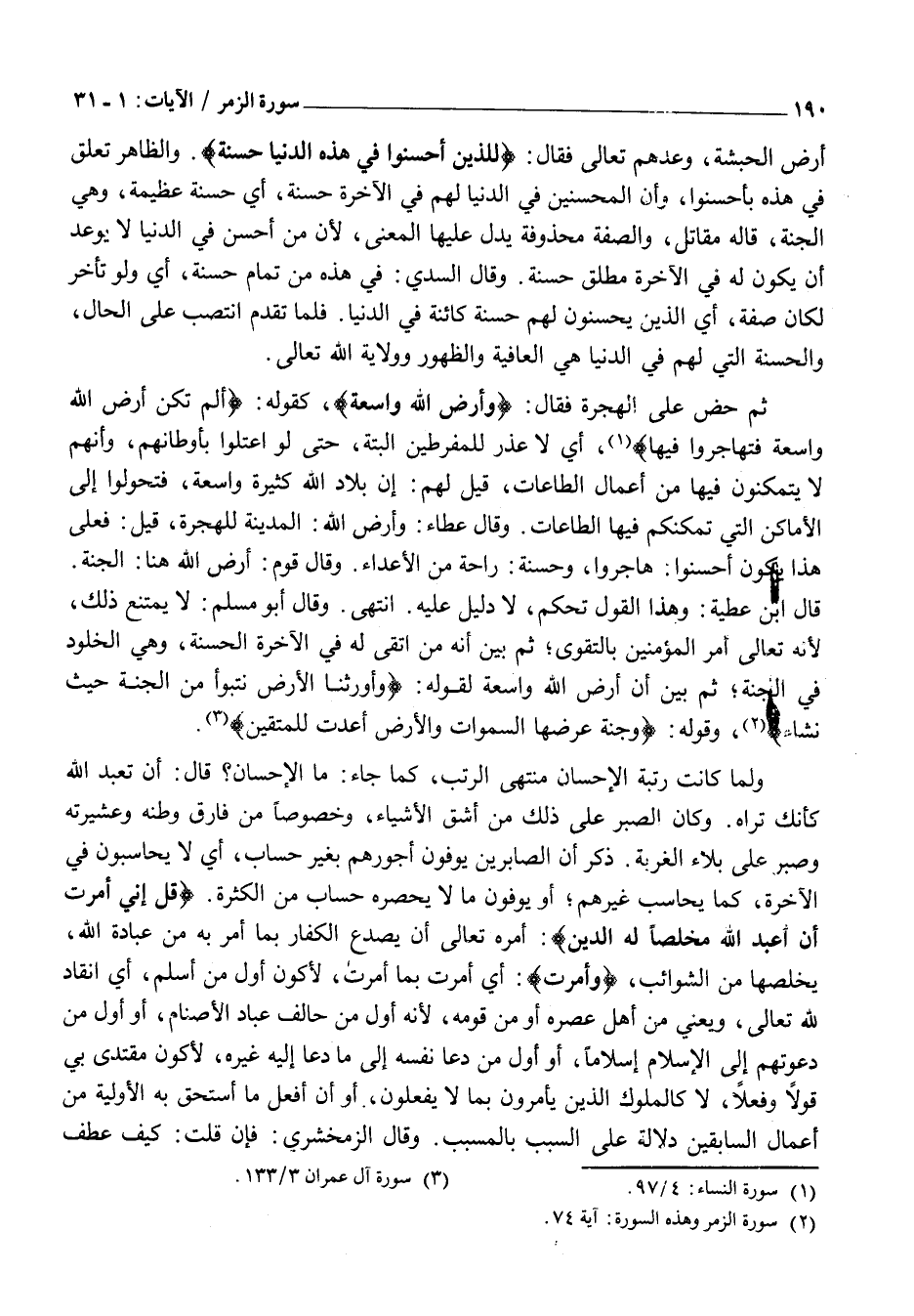 وَكَانَ الصَّبْرُ عَلَى ذَلِكَ مِنْ أَشَقِّ الْأَشْيَاءِ، وَخُصُوصًا مَنْ فَارَقَ وَطَنَهُ وَعَشِيرَتَهُ وَصَبَرَ عَلَى بَلَاءِ الْغُرْبَةِ. ذَكَرَ أَنَّ الصَّابِرِينَ يُوَفَّوْنَ أُجُورَهُمْ بِغَيْرِ حِسَابٍ، أَيْ لَا يُحَاسَبُونَ فِي الْآخِرَةِ، كَمَا يُحَاسَبُ غَيْرُهُمْ أَوْ يُوَفَّوْنَ مَا لَا يَحْصُرُهُ حِسَابٌ مِنَ الْكَثْرَةِ. قُلْ إِنِّي أُمِرْتُ أَنْ أَعْبُدَ اللَّهَ مُخْلِصاً لَهُ الدِّينَ: أَمَرَهُ تَعَالَى أَنْ يُصْدِعَ الْكُفَّارَ بِمَا أُمِرَ بِهِ مِنْ عِبَادَةِ اللَّهِ، يُخَلِّصَهَا مِنَ الشَّوَائِبِ، وَأُمِرْتُ: أَيْ أُمِرْتُ بِمَا أُمِرْتُ، لِأَكُونَ أَوَّلَ مَنْ أَسْلَمَ، أَيِ انْقَادَ لِلَّهِ تَعَالَى، وَيَعْنِي مِنْ أَهْلِ عَصْرِهِ أَوْ مِنْ قَوْمِهِ، لِأَنَّهُ أول من حالف عُبَّادَ الْأَصْنَامِ، أَوْ أَوَّلُ مَنْ دَعَوْتُهُمْ إِلَى الْإِسْلَامِ إِسْلَامًا، أَوْ أَوَّلُ مَنْ دَعَا نَفْسَهُ إِلَى مَا دَعَا إِلَيْهِ غَيْرَهُ، لِأَكُونَ مُقْتَدًى بِي قَوْلًا وَفِعْلًا، لَا كَالْمُلُوكِ الَّذِينَ يَأْمُرُونَ بِمَا لَا يَفْعَلُونَ، أَوْ أَنْ أَفْعَلَ مَا أَسْتَحِقُّ بِهِ الْأَوَّلِيَّةَ مِنَ أَعْمَالِ السَّابِقَيْنِ دَلَالَةً عَلَى السَّبَبِ بِالْمُسَبَّبِ. وَقَالَ الزَّمَخْشَرِيُّ: فَإِنْ قُلْتَ: كيف عطف