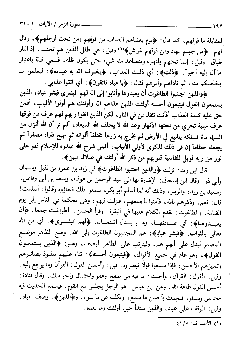 قَالَ: نَعَمْ، وَذَكَّرَهُمْ بِاللَّهِ، فَآمَنُوا بِأَجْمَعِهِمْ، فَنَزَلَتْ فِيهِمْ، وَهِيَ مُحْكَمَةٌ فِي النَّاسِ إِلَى يَوْمِ الْقِيَامَةِ. وَالطَّاغُوتُ: تَقَدَّمَ الْكَلَامُ عَلَيْهَا فِي الْبَقَرَةِ. وَقَرَأَ الْحَسَنُ: الطَّوَاغِيتَ جَمْعًا. أَنْ يَعْبُدُوها: أَيْ عِبَادَتَهَا، وَهُوَ بَدَلُ اشْتِمَالٍ. لَهُمُ الْبُشْرى: أَيْ مِنَ اللَّهِ تَعَالَى بِالثَّوَابِ. فَبَشِّرْ عِبادِ: هُمُ الْمُجْتَنِبُونَ الطَّاغُوتَ إِلَى اللَّهِ. وضع الظاهر موضع المضمر لِيَدُلَّ عَلَى أَنَّهُمْ هُمْ، وَلِيَتَرَتَّبَ عَلَى الظَّاهِرِ الْوَصْفُ، وَهُوَ: الَّذِينَ يَسْتَمِعُونَ الْقَوْلَ، وَهُوَ عَامٌّ فِي جَمِيعِ الْأَقْوَالِ، فَيَتَّبِعُونَ أَحْسَنَهُ: ثَنَاءٌ عَلَيْهِمْ بِنُفُوذِ بَصَائِرِهِمْ وَتَمْيِيزِهِمُ الْأَحْسَنَ، فَإِذَا سَمِعُوا قَوْلًا تَبَصَّرُوهُ. قِيلَ: وَأَحْسَنُ الْقَوْلِ: الْقُرْآنُ وَمَا يَرْجِعُ إِلَيْهِ.
