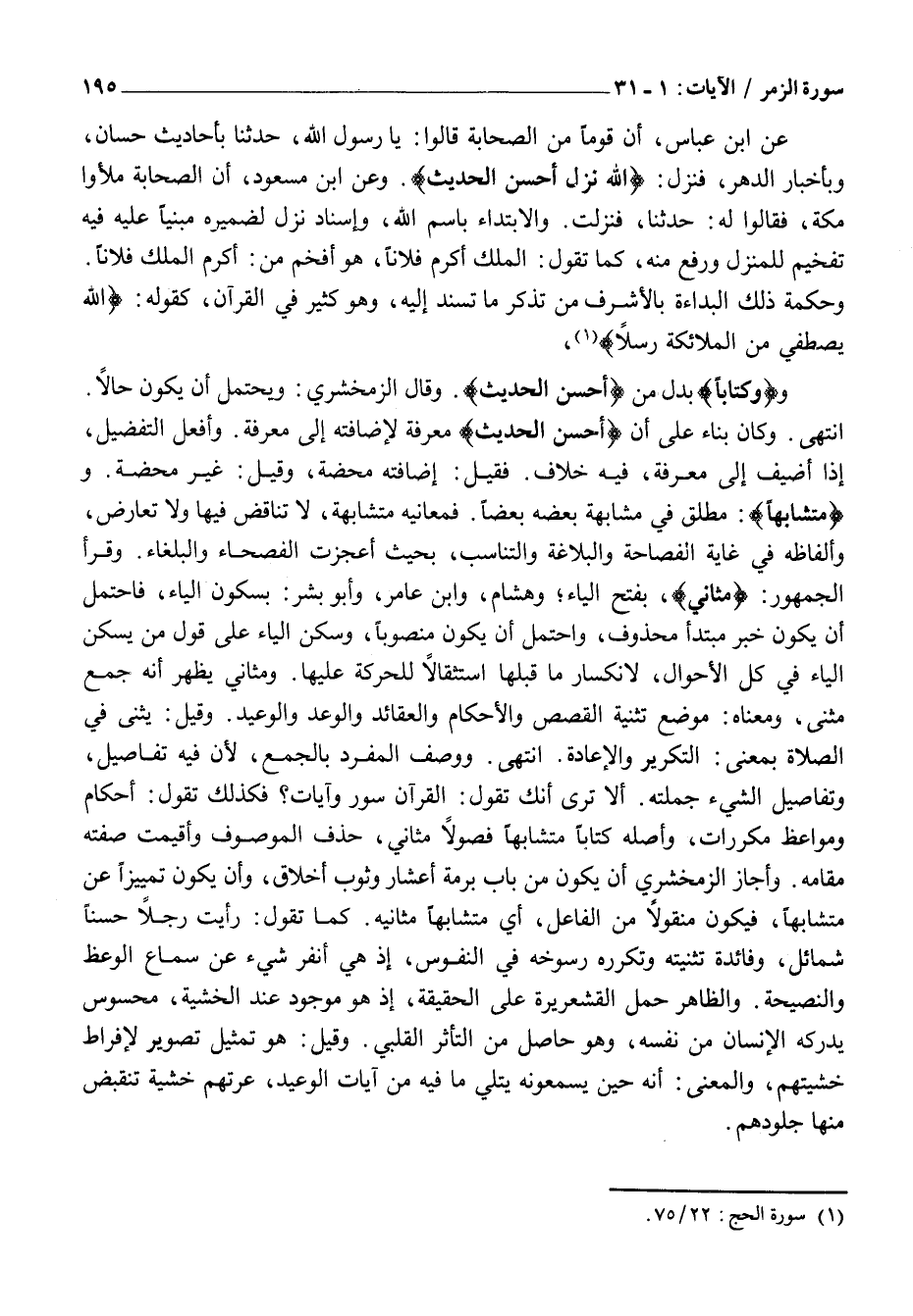 انْتَهَى. وَكَانَ بِنَاءً عَلَى أَنَّ أَحْسَنَ الْحَدِيثِ مَعْرِفَةٌ لِإِضَافَتِهِ إِلَى مَعْرِفَةٍ. وَأَفْعَلُ التَّفْضِيلِ، إِذَا أُضِيفَ إِلَى مَعْرِفَةٍ، فِيهِ خِلَافٌ. فَقِيلَ: إِضَافَتُهُ مَحْضَةٌ، وقيل: غير محضة. ومُتَشابِهاً: مُطْلَقٌ فِي مُشَابَهَةِ بَعْضِهِ بَعْضًا. فَمَعَانِيهِ مُتَشَابِهَةٌ، لَا تَنَاقُضَ فِيهَا وَلَا تَعَارُضَ، وَأَلْفَاظُهُ فِي غَايَةِ الْفَصَاحَةِ وَالْبَلَاغَةِ وَالتَّنَاسُبِ، بِحَيْثُ أَعْجَزَتِ الفصحاء وَالْبُلَغَاءَ. وَقَرَأَ الْجُمْهُورُ: مَثانِيَ، بِفَتْحِ الْيَاءِ وَهِشَامٌ، وَابْنُ عَامِرٍ، وَأَبُو بِشْرٍ: بِسُكُونِ الْيَاءِ، فَاحْتُمِلَ أَنْ يَكُونَ خَبَرَ مُبْتَدَأٍ مَحْذُوفٍ، وَاحْتُمِلَ أَنْ يَكُونَ مَنْصُوبًا، وَسَكَّنَ الْيَاءَ عَلَى قَوْلِ مَنْ يُسَكِّنُ الْيَاءَ فِي كُلِّ الْأَحْوَالِ، لِانْكِسَارِ مَا قَبْلَهَا استثقالا للحركة عليها. ومثاني يَظْهَرُ أَنَّهُ جَمْعُ مَثْنًى، وَمَعْنَاهُ: مَوْضِعُ تَثْنِيَةِ الْقَصَصِ وَالْأَحْكَامِ وَالْعَقَائِدِ وَالْوَعْدِ وَالْوَعِيدِ. وَقِيلَ: يُثَنِّي فِي الصَّلَاةِ بِمَعْنَى: التَّكْرِيرِ وَالْإِعَادَةِ. انْتَهَى. وَوَصَفَ الْمُفْرَدَ بِالْجَمْعِ، لِأَنَّ فِيهِ تَفَاصِيلَ، وَتَفَاصِيلُ الشَّيْءِ جُمْلَتُهُ. أَلَا تَرَى أَنَّكَ تَقُولُ: الْقُرْآنُ سُوَرٌ وَآيَاتٌ؟ فَكَذَلِكَ تَقُولُ: أَحْكَامٌ وَمَوَاعِظُ مُكَرَّرَاتٌ، وَأَصْلُهُ كِتَابًا مُتَشَابِهًا فُصُولًا مَثَانِيَ، حُذِفَ الْمَوْصُوفُ وَأُقِيمَتْ صِفَتُهُ مَقَامَهُ. وَأَجَازَ الزَّمَخْشَرِيُّ أَنْ يَكُونَ مِنْ بَابِ بُرْمَةٌ أَعْشَارٌ وُثَوْبٌ أَخْلَاقٌ، وَأَنْ يَكُونَ تَمْيِيزًا عَنْ مُتَشَابِهًا، فَيَكُونُ مَنْقُولًا مِنَ الْفَاعِلِ، أَيْ مُتَشَابِهًا مَثَانِيهِ. كَمَا تَقُولُ: رَأَيْتُ رَجُلًا حَسَنًا شَمَائِلَ، وَفَائِدَةُ تَثْنِيَتِهِ وَتَكُرُّرِهِ رُسُوخُهُ فِي النُّفُوسِ، إِذْ هِيَ أَنْفَرُ شَيْءٍ عَنْ سَمَاعِ الْوَعْظِ وَالنَّصِيحَةِ. وَالظَّاهِرُ حَمْلُ الْقُشَعْرِيرَةِ عَلَى الْحَقِيقَةِ، إِذْ هُوَ مَوْجُودٌ عِنْدَ الْخَشْيَةِ، مَحْسُوسٌ يُدْرِكُهُ الْإِنْسَانُ مِنْ نَفْسِهِ، وَهُوَ حَاصِلٌ مِنَ التَّأَثُّرِ الْقَلْبِيِّ. وَقِيلَ: هُوَ تَمْثِيلُ تَصْوِيرٍ لِإِفْرَاطِ خَشْيَتِهِمْ، وَالْمَعْنَى: أَنَّهُ حِينَ يَسْمَعُونَهُ يُتْلَى مَا فِيهِ مِنْ آيَاتِ الْوَعِيدِ، عَرَتْهُمْ خَشْيَةٌ تَنْقَبِضُ منها جلودهم.