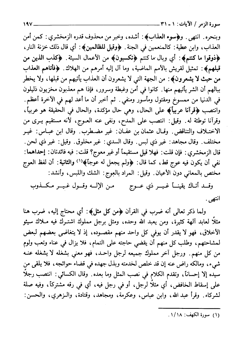 نَفَى أَنْ يَكُونَ فِيهِ عِوَجٌ قَطُّ، كَمَا قَالَ: وَلَمْ يَجْعَلْ لَهُ عِوَجاً «1» والثانية: أَنَّ لَفْظَ الْعِوَجِ مُخْتَصٌّ بِالْمَعَانِي دُونَ الْأَعْيَانِ. وَقِيلَ: الْمُرَادُ بِالْعِوَجِ: الشَّكُّ وَاللَّبْسُ، وَأَنْشَدَ: