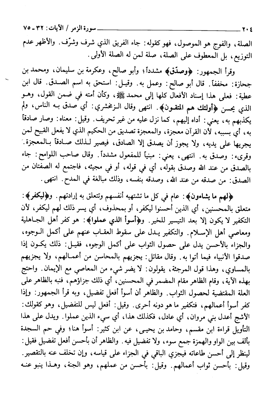 وَقَرَأَ الْجُمْهُورُ: وَصَدَّقَ مُشَدَّدًا وَأَبُو صَالِحٍ، وَعِكْرِمَةُ بْنُ سُلَيْمَانَ، وَمُحَمَّدُ بْنُ جُحَازَةَ: مُخَفَّفًا. قَالَ أَبُو صَالِحٍ: وَعَمِلَ بِهِ. وَقِيلَ: اسْتَحَقَّ بِهِ اسْمَ الصِّدْقِ. قَالَ ابْنُ عَطِيَّةَ: فَعَلَى هَذَا إِسْنَادُ الْأَفْعَالِ كُلِّهَا إِلَى مُحَمَّدٍ صَلَّى اللَّهُ عَلَيْهِ وَسَلَّمَ، وَكَأَنَّ أُمَّتَهُ فِي ضِمْنِ الْقَوْلِ، وَهُوَ الَّذِي يَحْسُنُ أُولئِكَ هُمُ الْمُتَّقُونَ. انْتَهَى وَقَالَ الزَّمَخْشَرِيُّ: أَيْ صَدَقَ بِهِ النَّاسَ، وَلَمْ يَكْذِبْهُمْ بِهِ، يَعْنِي: أَدَّاهُ إِلَيْهِمْ، كَمَا نَزَلَ عَلَيْهِ مِنْ غَيْرِ تَحْرِيفٍ. وَقِيلَ: مَعْنَاهُ: وَصَارَ صَادِقًا بِهِ، أَيْ بِسَبَبِهِ، لِأَنَّ الْقُرْآنَ مُعْجِزَةٌ، وَالْمُعْجِزَةُ تَصْدِيقٌ مِنَ الْحَكِيمِ الَّذِي لَا يَفْعَلُ الْقَبِيحَ لِمَنْ يُجْرِيهَا عَلَى يَدَيْهِ، وَلَا يَجُوزُ أَنْ يُصَدَّقَ إِلَّا الصَّادِقُ، فَيَصِيرُ لِذَلِكَ صادقا بالمعجزة.