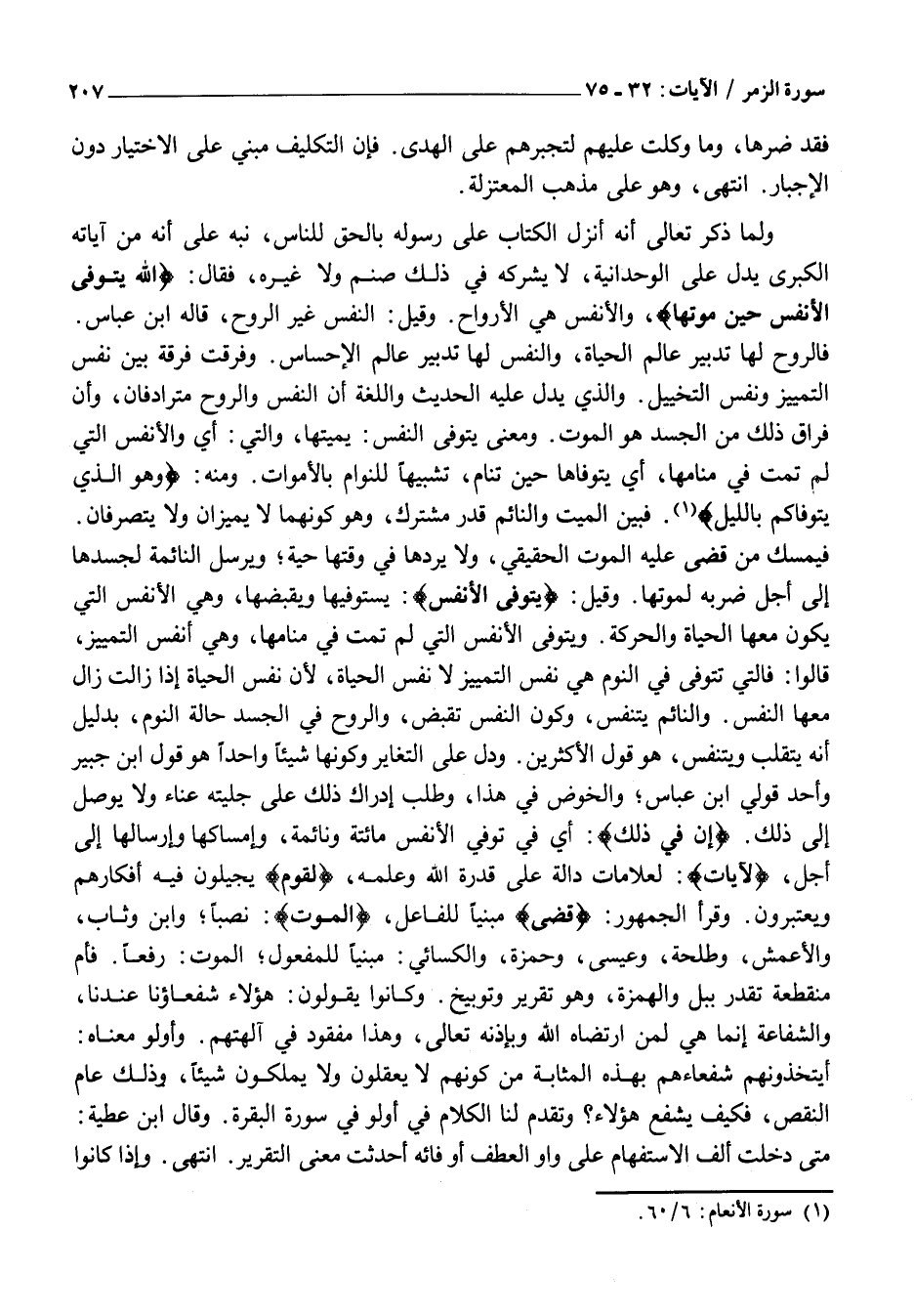 فَالرُّوحُ لَهَا تَدْبِيرُ عَالَمِ الْحَيَاةِ، وَالنَّفْسُ لَهَا تَدْبِيرُ عَالَمِ الْإِحْسَاسِ. وَفَرَّقَتْ فِرْقَةٌ بَيْنَ نَفْسِ التَّمْيِيزِ وَنَفْسِ التَّخْيِيلِ. وَالَّذِي يَدُلُّ عَلَيْهِ الْحَدِيثُ وَاللُّغَةُ أَنَّ النَّفْسَ وَالرُّوحَ مُتَرَادِفَانِ، وَأَنَّ فِرَاقَ ذَلِكَ مِنَ الْجَسَدِ هُوَ الْمَوْتُ. وَمَعْنَى يَتَوَفَّى النَّفْسَ: يُمِيتُهَا، وَالَّتِي: أَيْ وَالْأَنْفُسُ الَّتِي لَمْ تَمُتْ فِي مَنَامِهَا، أَيْ يَتَوَفَّاهَا حِينَ تَنَامُ، تَشْبِيهًا لِلنُّوَامِ بِالْأَمْوَاتِ. وَمِنْهُ: وَهُوَ الَّذِي يَتَوَفَّاكُمْ بِاللَّيْلِ «1» . فَبَيْنَ الْمَيِّتِ وَالنَّائِمِ قَدْرٌ مُشْتَرَكٌ، وَهُوَ كَوْنُهُمَا لَا يُمَيِّزَانِ وَلَا يَتَصَرَّفَانِ.