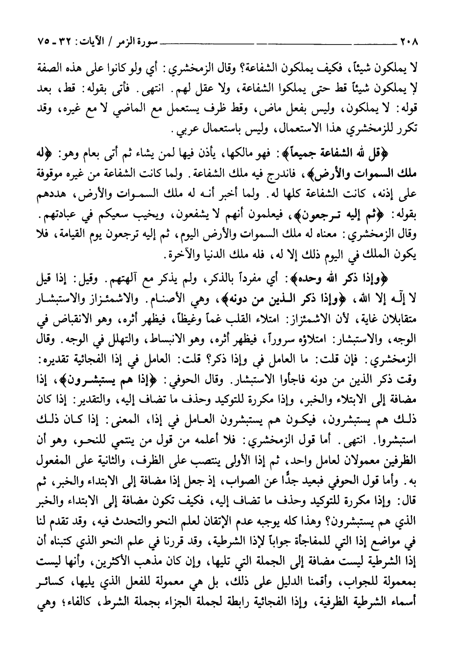 وَقْتُ ذِكْرِ الَّذِينَ مِنْ دُونِهِ فَاجَأُوا الِاسْتِبْشَارَ. وَقَالَ الْحَوْفِيُّ: إِذا هُمْ يَسْتَبْشِرُونَ، إِذَا مُضَافَةٌ إِلَى الِابْتِلَاءِ وَالْخَبَرِ، وَإِذَا مُكَرَّرَةٌ لِلتَّوْكِيدِ وَحُذِفَ مَا تُضَافُ إِلَيْهِ، وَالتَّقْدِيرُ: إِذَا كَانَ ذَلِكَ هُمْ يَسْتَبْشِرُونَ، فَيَكُونُ هُمْ يَسْتَبْشِرُونَ الْعَامِلَ فِي إِذَا، الْمَعْنَى: إِذَا كَانَ ذَلِكَ اسْتَبْشَرُوا. انْتَهَى. أَمَّا قَوْلُ الزَّمَخْشَرِيِّ: فَلَا أَعْلَمُهُ مِنْ قَوْلِ مَنْ يَنْتَمِي لِلنَّحْوِ، وَهُوَ أَنَّ الظَّرْفَيْنِ مَعْمُولَانِ لِعَامِلٍ وَاحِدٍ، ثُمَّ إِذَا الْأُولَى يَنْتَصِبُ عَلَى الظَّرْفِ، وَالثَّانِيَةُ عَلَى الْمَفْعُولِ بِهِ. وَأَمَّا قَوْلُ الْحَوْفِيِّ فَبَعِيدٌ جِدًّا عَنِ الصَّوَابِ، إِذْ جَعَلَ إِذَا مُضَافَةً إِلَى الِابْتِدَاءِ وَالْخَبَرِ، ثُمَّ قَالَ: وَإِذَا مُكَرَّرَةٌ لِلتَّوْكِيدِ وَحُذِفَ مَا تُضَافُ إِلَيْهِ، فَكَيْفَ تَكُونُ مُضَافَةً إِلَى الِابْتِدَاءِ وَالْخَبَرِ الَّذِي هُمْ يَسْتَبْشِرُونَ؟ وَهَذَا كُلُّهُ يُوجِبُهُ عَدَمُ الْإِتْقَانِ لِعِلْمِ النَّحْوِ وَالتَّحَدُّثِ فِيهِ، وَقَدْ تَقَدَّمَ لَنَا فِي مَوَاضِعِ إِذَا الَّتِي لِلْمُفَاجَأَةِ جَوَابًا لِإِذَا الشَّرْطِيَّةِ، وَقَدْ قَرَّرْنَا فِي عِلْمِ النَّحْوِ الَّذِي كَتَبْنَاهُ أَنَّ إِذَا الشَّرْطِيَّةَ لَيْسَتْ مُضَافَةً إِلَى الْجُمْلَةِ الَّتِي تَلِيهَا، وَإِنْ كَانَ مَذْهَبَ الْأَكْثَرِينَ، وَأَنَّهَا لَيْسَتْ بِمَعْمُولَةٍ لِلْجَوَابِ، وَأَقَمْنَا الدَّلِيلَ عَلَى ذَلِكَ، بَلْ هِيَ مَعْمُولَةٌ لِلْفِعْلِ الَّذِي يَلِيهَا، كَسَائِرِ أَسْمَاءِ الشَّرْطِيَّةِ الظَّرْفِيَّةِ، وَإِذَا الْفُجَائِيَّةُ رَابِطَةً لِجُمْلَةِ الْجَزَاءِ بِجُمْلَةِ الشَّرْطِ، كَالْفَاءِ وَهِيَ