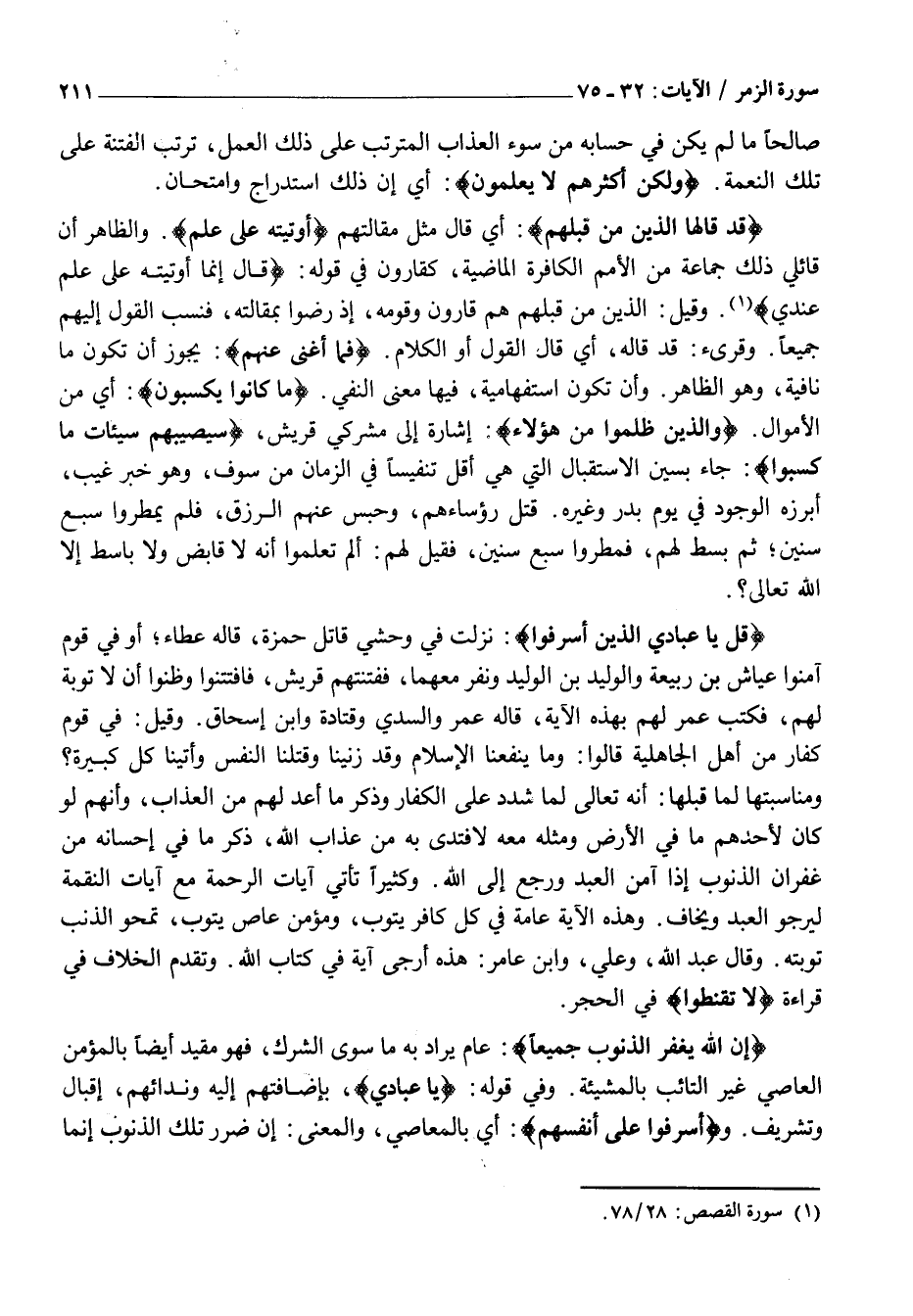 قُلْ يَا عِبادِيَ الَّذِينَ أَسْرَفُوا: نَزَلَتْ فِي وَحْشِيٍّ قَاتِلِ حَمْزَةَ، قَالَهُ عَطَاءٌ أَوْ فِي قَوْمٍ آمَنُوا عَيَّاشِ بْنُ رَبِيعَةَ وَالْوَلِيدُ بْنُ الْوَلِيدِ وَنَفَرٍ مَعَهُمَا، فَفَتَنَتْهُمْ قُرَيْشٌ، فَافْتَتَنُوا وَظَنُّوا أَنْ لَا تَوْبَةَ لَهُمْ، فَكَتَبَ عُمَرُ لَهُمْ بِهَذِهِ الْآيَةِ، قَالَهُ عُمَرُ وَالسُّدِّيُّ وَقَتَادَةُ وَابْنُ إِسْحَاقَ. وَقِيلَ: فِي قَوْمٍ كُفَّارٍ مِنْ أَهْلِ الْجَاهِلِيَّةِ قَالُوا: وَمَا يَنْفَعُنَا الْإِسْلَامُ وَقَدْ زَنَيْنَا وَقَتَلْنَا النَّفْسَ وَأَتَيْنَا كُلَّ كَبِيرَةٍ؟