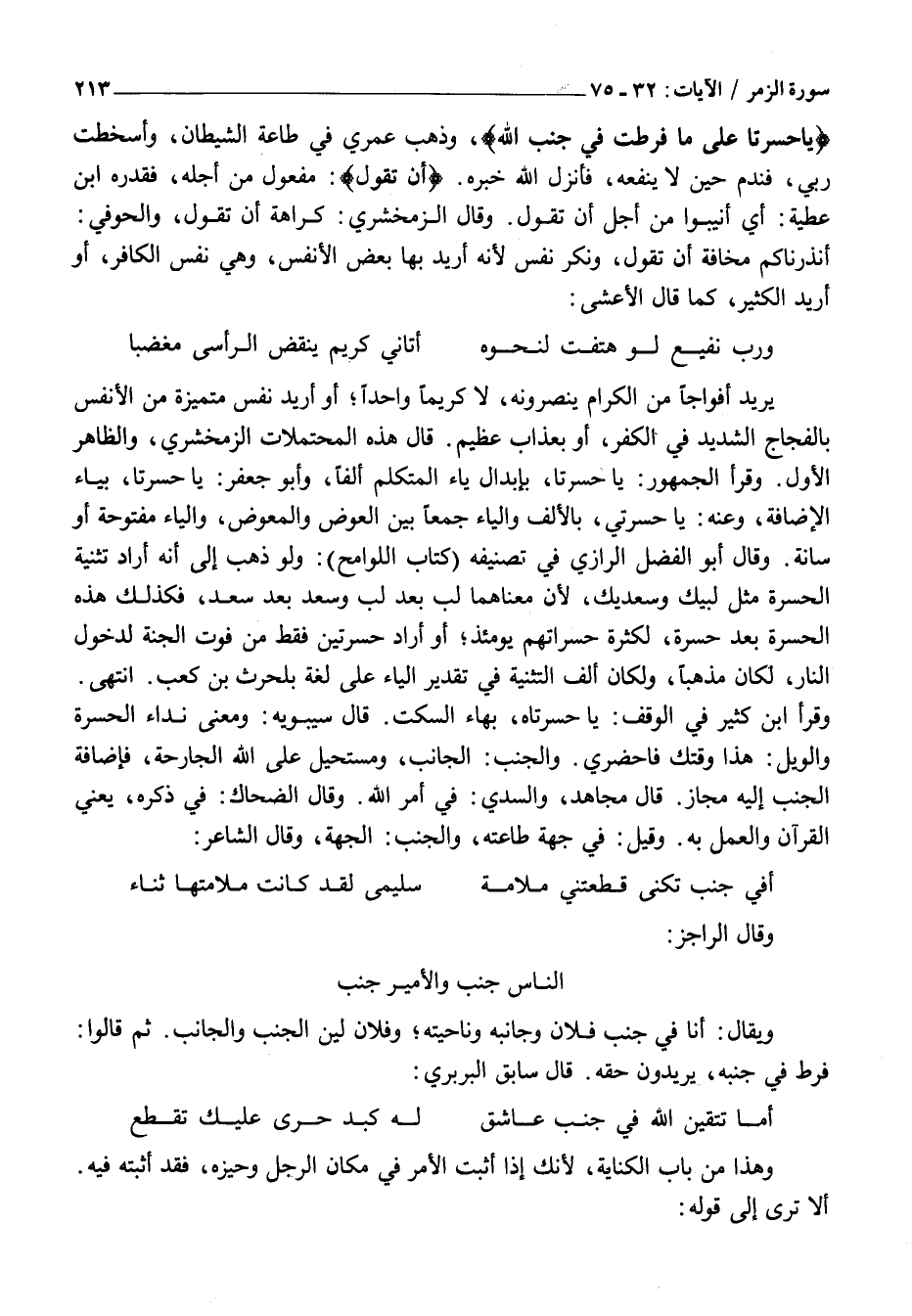 وَقَرَأَ ابْنُ كَثِيرٍ فِي الْوَقْفِ: يَا حَسْرَتَاهُ، بِهَاءِ السَّكْتِ. قَالَ سِيبَوَيْهِ: وَمَعْنَى نِدَاءِ الْحَسْرَةِ وَالْوَيْلِ: هَذَا وَقْتُكِ فَاحْضُرِي. وَالْجَنْبُ: الْجَانِبُ، وَمُسْتَحِيلٌ عَلَى اللَّهِ الْجَارِحَةُ، فَإِضَافَةُ الْجَنْبِ إِلَيْهِ مَجَازٌ. قَالَ مُجَاهِدٌ، وَالسُّدِّيُّ: فِي أَمْرِ اللَّهِ. وَقَالَ الضَّحَّاكُ: فِي ذِكْرِهِ، يَعْنِي الْقُرْآنَ وَالْعَمَلَ بِهِ. وَقِيلَ: فِي جِهَةِ طَاعَتِهِ، وَالْجَنْبُ: الْجِهَةُ، وَقَالَ الشَّاعِرُ: