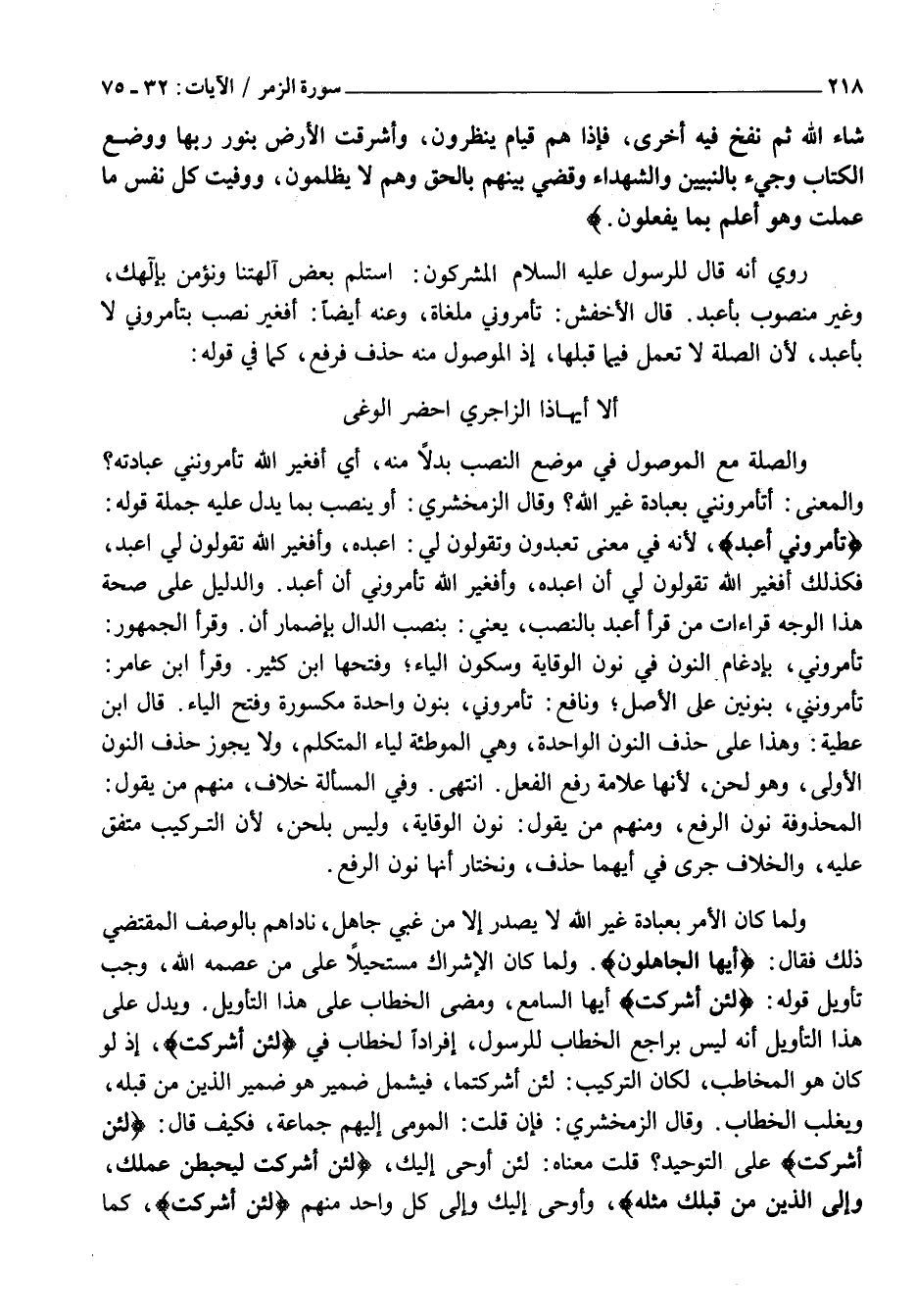 تَأْمُرُونِّي أَعْبُدُ، لِأَنَّهُ فِي مَعْنَى تَعْبُدُونَ وَتَقُولُونَ لِي: اعبده، وأ فغير اللَّهِ تَقُولُونَ لِي أَعْبُدُ، فَكَذَلِكَ أَفَغَيْرَ اللَّهِ تَقُولُونَ لي أن اعبده، وأ فغير اللَّهِ تَأْمُرُونِّي أَنْ أَعْبُدَ. وَالدَّلِيلُ عَلَى صِحَّةِ هَذَا الْوَجْهِ قِرَاءَاتُ مَنْ قَرَأَ أَعْبُدَ بِالنَّصْبِ، يَعْنِي: بِنَصْبِ الدَّالِ بِإِضْمَارِ أَنْ. وَقَرَأَ الْجُمْهُورُ: