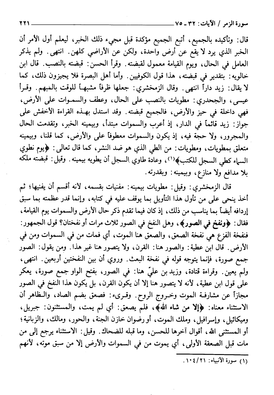 قَالَ الزَّمَخْشَرِيُّ: وَقِيلَ: مَطْوِيَّاتٌ بِيَمِينِهِ: مُفْنَيَاتٌ بِقَسَمِهِ، لِأَنَّهُ أَقْسَمَ أَنَّ يُفْنِيَهَا ثُمَّ أَخَذَ يُنَحِّي عَلَى مَنْ تَأَوَّلَ هَذَا التَّأْوِيلَ بِمَا يُوقَفُ عَلَيْهِ فِي كِتَابِهِ، وَإِنَّمَا قَدَّرَ عَظَمَتَهُ بِمَا سَبَقَ إِرْدَافُهُ أَيْضًا بِمَا يُنَاسِبُ مِنْ ذَلِكَ، إِذْ كَانَ فِيمَا تَقَدَّمَ ذَكَرَ حَالَ الْأَرْضِ والسموات يَوْمَ الْقِيَامَةِ، فَقَالَ: وَنُفِخَ فِي الصُّورِ، وَهَلِ النَّفْخُ فِي الصُّورِ ثَلَاثُ مَرَّاتٍ أَوْ نَفْخَتَانِ؟ قَوْلُ الْجُمْهُورِ: