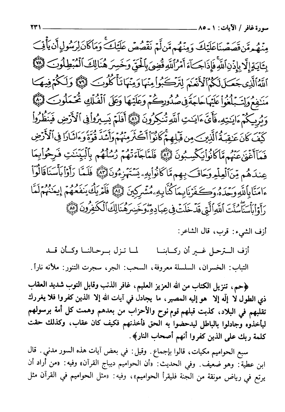 حم، تَنْزِيلُ الْكِتابِ مِنَ اللَّهِ الْعَزِيزِ الْعَلِيمِ، غافِرِ الذَّنْبِ وَقابِلِ التَّوْبِ شَدِيدِ الْعِقابِ ذِي الطَّوْلِ لَا إِلهَ إِلَّا هُوَ إِلَيْهِ الْمَصِيرُ، مَا يُجادِلُ فِي آياتِ اللَّهِ إِلَّا الَّذِينَ كَفَرُوا فَلا يَغْرُرْكَ تَقَلُّبُهُمْ فِي الْبِلادِ، كَذَّبَتْ قَبْلَهُمْ قَوْمُ نُوحٍ وَالْأَحْزابُ مِنْ بَعْدِهِمْ وَهَمَّتْ كُلُّ أُمَّةٍ بِرَسُولِهِمْ لِيَأْخُذُوهُ وَجادَلُوا بِالْباطِلِ لِيُدْحِضُوا بِهِ الْحَقَّ فَأَخَذْتُهُمْ فَكَيْفَ كانَ عِقابِ، وَكَذلِكَ حَقَّتْ كَلِمَةُ رَبِّكَ عَلَى الَّذِينَ كَفَرُوا أَنَّهُمْ أَصْحابُ النَّارِ.