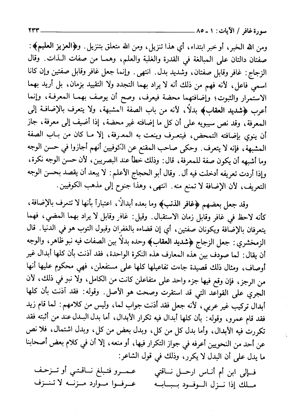 وَقَدْ جَعَلَ بَعْضُهُمْ غافِرِ الذَّنْبِ وَمَا بَعْدَهُ أَبْدَالًا، اعْتِبَارًا بِأَنَّهَا لَا تَتَعَرَّفُ بِالْإِضَافَةِ، كأنه لا حظ في غافر وقابل زَمَانَ الِاسْتِقْبَالِ. وَقِيلَ: غَافِرِ وقابل لَا يُرَادُ بِهِمَا الْمُضِيُّ، فَهُمَا يَتَعَرَّفَانِ بِالْإِضَافَةِ وَيَكُونَانِ صِفَتَيْنِ، أَيْ إِنَّ قَضَاءَهُ بِالْغُفْرَانِ وَقَبُولِ التَّوْبِ هُوَ فِي الدُّنْيَا. قَالَ الزَّمَخْشَرِيُّ: جَعْلُ الزَّجَّاجِ شَدِيدِ الْعِقابِ وَحْدَهُ بَدَلًا بَيْنَ الصِّفَاتِ فِيهِ نُبُوٌ ظَاهِرٌ، وَالْوَجْهُ أَنْ يُقَالَ: لَمَّا صُودِفَ بَيْنَ هَذِهِ الْمَعَارِفِ هَذِهِ النَّكِرَةُ الْوَاحِدَةُ، فَقَدْ آذَنَتْ بِأَنَّ كُلَّهَا أَبِدَالٌ غَيْرُ أَوْصَافٍ، وَمِثَالُ ذَلِكَ قَصِيدَةٌ جَاءَتْ تَفَاعِيلُهَا كُلُّهَا عَلَى مُسْتَفْعِلُنْ، فَهِيَ مَحْكُومٌ عَلَيْهَا أَنَّهَا مِنَ الرَّجَزِ، فَإِنْ وَقَعَ فِيهَا جُزْءٌ وَاحِدٌ عَلَى مُتَفَاعِلُنْ كَانَتْ مِنَ الْكَامِلِ، وَلَا نُبُوَ فِي ذَلِكَ، لِأَنَّ الْجَرْيَ عَلَى الْقَوَاعِدِ الَّتِي قَدِ اسْتَقَرَّتْ وَصَحَّتْ هُوَ الْأَصْلُ. وَقَوْلُهُ: فَقَدْ آذَنَتْ بِأَنَّ كُلَّهَا أَبْدَالُ تَرْكِيبٍ غَيْرِ عَرَبِيٍّ، لِأَنَّهُ جَعَلَ فَقَدْ آذَنَتْ جَوَابَ لَمَّا، وَلَيْسَ مِنَ كَلَامِهِمْ: لَمَّا قَامَ زَيْدٌ فَقَدْ قَامَ عَمْرٌو، وَقَوْلُهُ: بِأَنَّ كُلَّهَا أَبْدَالٌ فِيهِ تَكْرَارُ الْأَبْدَالِ، أَمَّا بَدَلُ الْبَدَلِ عِنْدَ مَنْ أَثْبَتَهُ فَقَدْ تَكَرَّرَتْ فِيهِ الْأَبْدَالُ، وَأَمَّا بَدَلَ كُلٍّ مِنْ كُلٍّ، وَبَدَلُ بَعْضٍ مِنْ كُلٍّ، وَبَدَلِ اشْتِمَالٍ، فَلَا نَصَّ عَنْ أَحَدٍ مِنَ النَّحْوِيِّينَ أَعْرِفُهُ فِي جَوَازِ التَّكْرَارِ فِيهَا، أَوْ مَنْعِهِ، إِلَّا أَنَّ فِي كَلَامِ بَعْضِ أَصْحَابِنَا مَا يَدُلُّ عَلَى أَنَّ الْبَدَلَ لَا يُكَرَّرُ، وَذَلِكَ فِي قَوْلِ الشَّاعِرِ:
