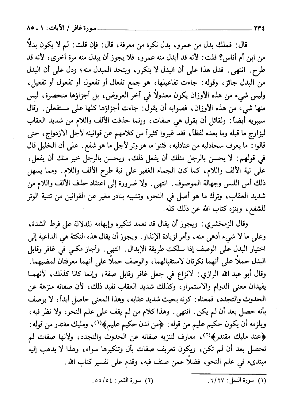 عِنْدَ مَلِيكٍ مُقْتَدِرٍ «2» ، مَعَارِفَ لِتَنْزِيهِ صِفَاتِهِ عَنِ الْحُدُوثِ وَالتَّجَدُّدِ، وَلِأَنَّهَا صِفَاتٌ لَمْ تَحْصُلْ بَعْدَ أَنْ لَمْ تَكُنْ، وَيَكُونُ تَعْرِيفُ صِفَاتٍ بِأَلْ وَتَنْكِيرُهَا سَوَاءً، وَهَذَا لَا يَذْهَبُ إِلَيْهِ مبتدىء فِي عِلْمِ النَّحْوِ، فَضْلًا عَمَّنْ صَنَّفَ فِيهِ، وَقَدِمَ عَلَى تَفْسِيرِ كِتَابِ اللَّهِ.