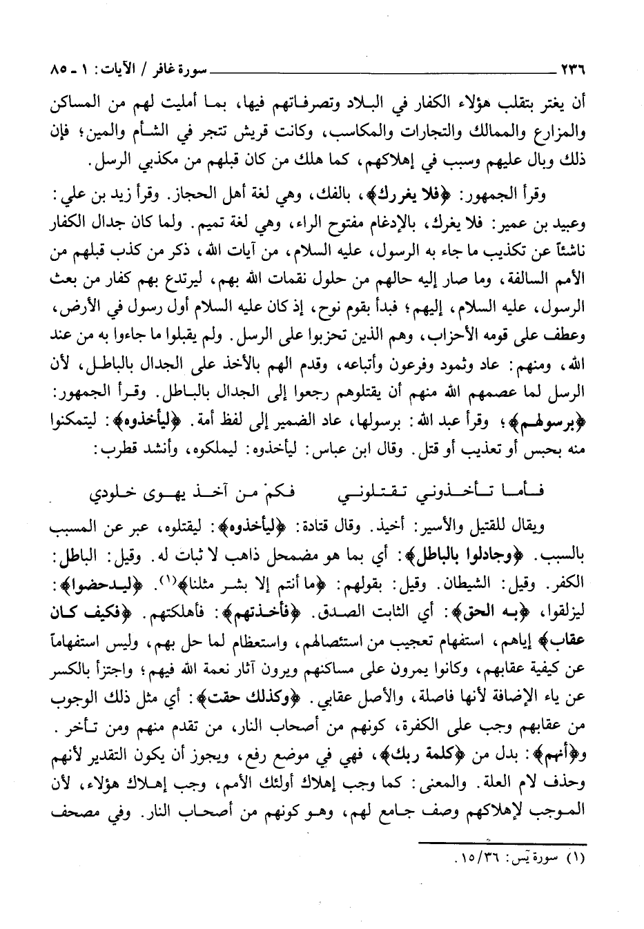 وَعُبَيْدُ بْنُ عُمَيْرٍ: فَلَا يَغُرَّكَ، بِالْإِدْغَامِ مَفْتُوحَ الرَّاءِ، وَهِيَ لُغَةُ تَمِيمٍ. وَلَمَّا كَانَ جِدَالُ الْكُفَّارِ نَاشِئًا عَنْ تَكْذِيبِ مَا جَاءَ بِهِ الرَّسُولُ، عَلَيْهِ السَّلَامُ، مِنْ آيَاتِ اللَّهِ، ذَكَرَ مَنْ كَذَّبَ قَبْلَهُمْ مِنَ الْأُمَمِ السَّالِفَةِ، وَمَا صَارَ إِلَيْهِ حَالُهُمْ مِنْ حُلُولِ نَقْمَاتِ اللَّهِ بِهِمْ، لِيَرْتَدِعَ بِهِمْ كَفَّارُ مَنْ بَعَثَ الرَّسُولُ، عَلَيْهِ السَّلَامُ، إِلَيْهِمْ فَبَدَأَ بِقَوْمِ نُوحٍ، إِذْ كَانَ عَلَيْهِ السَّلَامُ أَوَّلَ رَسُولٍ فِي الْأَرْضِ، وَعَطَفَ عَلَى قَوْمِهِ الْأَحْزَابَ، وَهُمُ الَّذِينَ تَحَزَّبُوا عَلَى الرُّسُلِ. وَلَمْ يَقْبَلُوا مَا جَاءُوا بِهِ مِنْ عِنْدِ اللَّهِ، وَمِنْهُمْ: عَادٌ وَثَمُودُ وَفِرْعَوْنُ وَأَتْبَاعُهُ، وَقَدَّمَ الْهَمَّ بِالْأَخْذِ عَلَى الْجِدَالِ بِالْبَاطِلِ، لِأَنَّ الرُّسُلَ لَمَّا عَصَمَهُمُ اللَّهُ مِنْهُمْ أَنْ يَقْتُلُوهُمْ رَجَعُوا إِلَى الْجِدَالِ بِالْبَاطِلِ. وَقَرَأَ الْجُمْهُورُ: