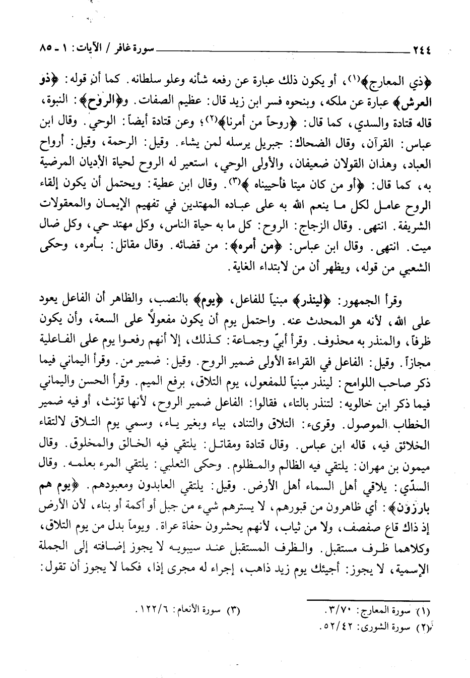 ذِي الْمَعارِجِ «1» ، أَوْ يَكُونَ ذَلِكَ عِبَارَةً عَنْ رَفْعَةِ شَأْنِهِ وَعُلُوِّ سُلْطَانِهِ. كَمَا أَنَّ قَوْلَهُ: ذُو الْعَرْشِ عِبَارَةٌ عَنْ مُلْكِهِ، وَبِنَحْوِهِ فَسَّرَ ابْنُ زَيْدٍ قَالَ: عظيم الصفات. والرُّوحَ: النُّبُوَّةَ، قَالَهُ قَتَادَةُ وَالسُّدِّيُّ، كَمَا قَالَ: رُوحاً مِنْ أَمْرِنا «2» وَعَنْ قَتَادَةَ أَيْضًا: الْوَحْيَ. وَقَالَ ابْنُ عَبَّاسٍ: الْقُرْآنَ، وَقَالَ الضَّحَّاكُ: جِبْرِيلُ يُرْسِلُهُ لِمَنْ يَشَاءُ. وَقِيلَ: الرَّحْمَةُ، وَقِيلَ: أَرْوَاحُ الْعِبَادِ، وَهَذَانِ الْقَوْلَانِ ضَعِيفَانِ، وَالْأَوْلَى الْوَحْيُ، اسْتُعِيرَ لَهُ الرُّوحُ لِحَيَاةِ الْأَدْيَانِ الْمَرْضِيَّةِ بِهِ، كَمَا قَالَ: أَوَمَنْ كانَ مَيْتاً فَأَحْيَيْناهُ «3» . وَقَالَ ابْنُ عَطِيَّةَ: وَيُحْتَمَلُ أن يكون إلقاء الروح عامل لِكُلِّ مَا يُنْعِمُ اللَّهُ بِهِ عَلَى عِبَادِهِ الْمُهْتَدِينَ فِي تَفْهِيمِ الْإِيمَانِ وَالْمَعْقُولَاتِ الشَّرِيفَةِ. انْتَهَى. وَقَالَ الزَّجَّاجُ: الرُّوحُ: كُلُّ مَا بِهِ حَيَاةُ النَّاسِ، وَكُلُّ مُهْتَدٍ حَيٌّ، وَكُلُّ ضَالٍّ مَيِّتٌ. انْتَهَى. وَقَالَ ابْنُ عَبَّاسٍ: مِنْ أَمْرِهِ: مِنْ قَضَائِهِ. وَقَالَ مُقَاتِلٌ: بِأَمْرِهِ، وَحَكَى الشَّعْبِيُّ مِنْ قَوْلِهِ، وَيَظْهَرُ أَنَّ مِنْ لِابْتِدَاءِ الْغَايَةِ.