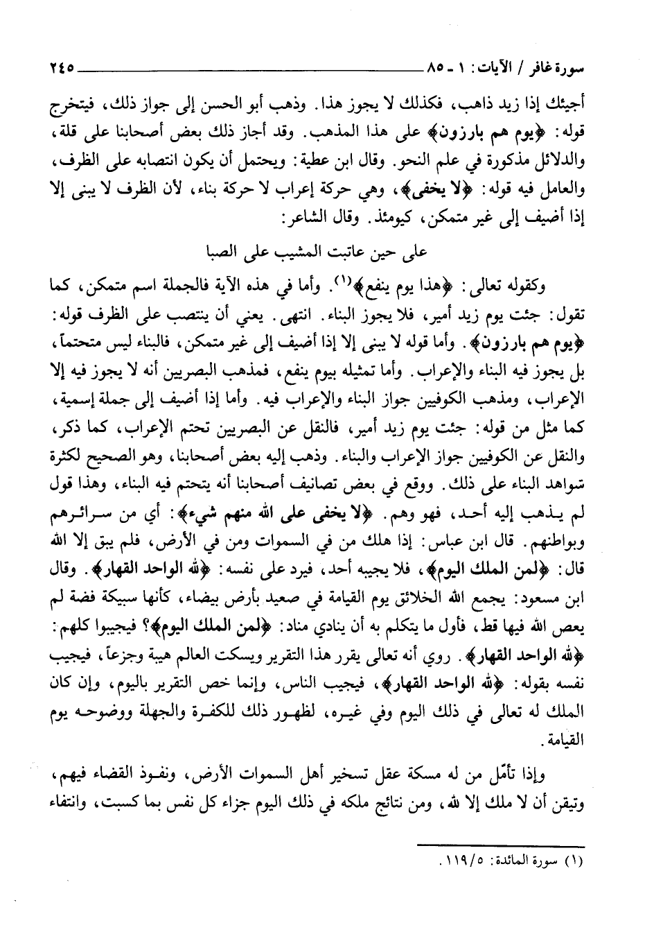 يَوْمَ هُمْ بارِزُونَ. وَأَمَّا قَوْلُهُ لَا يُبْنَى إِلَّا إِذَا أُضِيفَ إِلَى غَيْرِ مُتَمَكِّنٍ، فَالْبِنَاءُ لَيْسَ مُتَحَتِّمًا، بَلْ يَجُوزُ فِيهِ الْبِنَاءُ وَالْإِعْرَابُ. وَأَمَّا تَمْثِيلُهُ بيوم يَنْفَعُ، فَمَذْهَبُ الْبَصْرِيِّينَ أَنَّهُ لَا يَجُوزُ فِيهِ إِلَّا الْإِعْرَابُ، وَمَذْهَبُ الْكُوفِيِّينَ جَوَازُ الْبِنَاءِ وَالْإِعْرَابِ فِيهِ. وَأَمَّا إِذَا أُضِيفَ إِلَى جُمْلَةٍ اسْمِيَّةٍ، كَمَّا مَثَّلَ مِنْ قَوْلِهِ: جِئْتُ يَوْمَ زَيْدٌ أَمِيرٌ، فَالنَّقْلُ عَنِ الْبَصْرِيِّينَ تَحَتُّمُ الْإِعْرَابِ، كَمَا ذُكِرَ، وَالنَّقْلُ عَنِ الْكُوفِيِّينَ جَوَازُ الْإِعْرَابِ وَالْبِنَاءِ. وَذَهَبَ إِلَيْهِ بَعْضُ أَصْحَابِنَا، وَهُوَ الصَّحِيحُ لِكَثْرَةِ شَوَاهِدِ الْبِنَاءِ عَلَى ذَلِكَ. وَوَقَعَ فِي بَعْضِ تَصَانِيفِ أَصْحَابِنَا أَنَّهُ يَتَحَتَّمُ فِيهِ الْبِنَاءُ، وَهَذَا قَوْلٌ لَمْ يَذْهَبْ إِلَيْهِ أَحَدٌ، فَهُوَ وَهْمٌ. لَا يَخْفى عَلَى اللَّهِ مِنْهُمْ شَيْءٌ: أَيْ مِنْ سَرَائِرِهِمْ وَبَوَاطِنِهِمْ. قَالَ ابْنُ عَبَّاسٍ: إِذَا هلك من في السموات وَمَنْ فِي الْأَرْضِ، فَلَمْ يَبْقَ إِلَّا اللَّهُ قَالَ: لِمَنِ الْمُلْكُ الْيَوْمَ، فَلَا يُجِيبُهُ أَحَدٌ، فَيَرُدُّ عَلَى نَفْسِهِ: لِلَّهِ الْواحِدِ الْقَهَّارِ. وَقَالَ ابْنُ مَسْعُودٍ: يَجْمَعُ اللَّهُ الْخَلَائِقَ يَوْمَ الْقِيَامَةِ فِي صَعِيدٍ بِأَرْضٍ بَيْضَاءَ، كَأَنَّهَا سَبِيكَةُ فِضَّةٍ لَمْ يُعْصَ اللَّهُ فِيهَا قَطُّ، فَأَوَّلُ مَا يَتَكَلَّمُ بِهِ أَنْ يُنَادِيَ مُنَادٍ: لِمَنِ الْمُلْكُ الْيَوْمَ؟ فيجيبوا كُلُّهُمْ:
