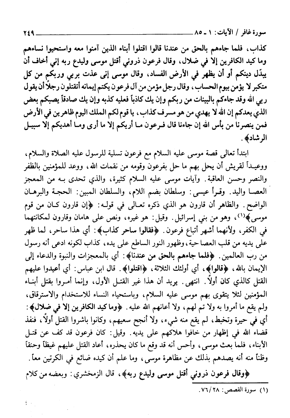 كَذَّابٌ، فَلَمَّا جاءَهُمْ بِالْحَقِّ مِنْ عِنْدِنا قالُوا اقْتُلُوا أَبْناءَ الَّذِينَ آمَنُوا مَعَهُ وَاسْتَحْيُوا نِساءَهُمْ وَما كَيْدُ الْكافِرِينَ إِلَّا فِي ضَلالٍ، وَقالَ فِرْعَوْنُ ذَرُونِي أَقْتُلْ مُوسى وَلْيَدْعُ رَبَّهُ إِنِّي أَخافُ أَنْ يُبَدِّلَ دِينَكُمْ أَوْ أَنْ يُظْهِرَ فِي الْأَرْضِ الْفَسادَ، وَقالَ مُوسى إِنِّي عُذْتُ بِرَبِّي وَرَبِّكُمْ مِنْ كُلِّ مُتَكَبِّرٍ لَا يُؤْمِنُ بِيَوْمِ الْحِسابِ، وَقالَ رَجُلٌ مُؤْمِنٌ مِنْ آلِ فِرْعَوْنَ يَكْتُمُ إِيمانَهُ أَتَقْتُلُونَ رَجُلًا أَنْ يَقُولَ رَبِّيَ اللَّهُ وَقَدْ جاءَكُمْ بِالْبَيِّناتِ مِنْ رَبِّكُمْ وَإِنْ يَكُ كاذِباً فَعَلَيْهِ كَذِبُهُ وَإِنْ يَكُ صادِقاً يُصِبْكُمْ بَعْضُ الَّذِي يَعِدُكُمْ إِنَّ اللَّهَ لَا يَهْدِي مَنْ هُوَ مُسْرِفٌ كَذَّابٌ، يَا قَوْمِ لَكُمُ الْمُلْكُ الْيَوْمَ ظاهِرِينَ فِي الْأَرْضِ فَمَنْ يَنْصُرُنا مِنْ بَأْسِ اللَّهِ إِنْ جاءَنا قالَ فِرْعَوْنُ مَا أُرِيكُمْ إِلَّا مَا أَرى وَما أَهْدِيكُمْ إِلَّا سَبِيلَ الرَّشادِ.