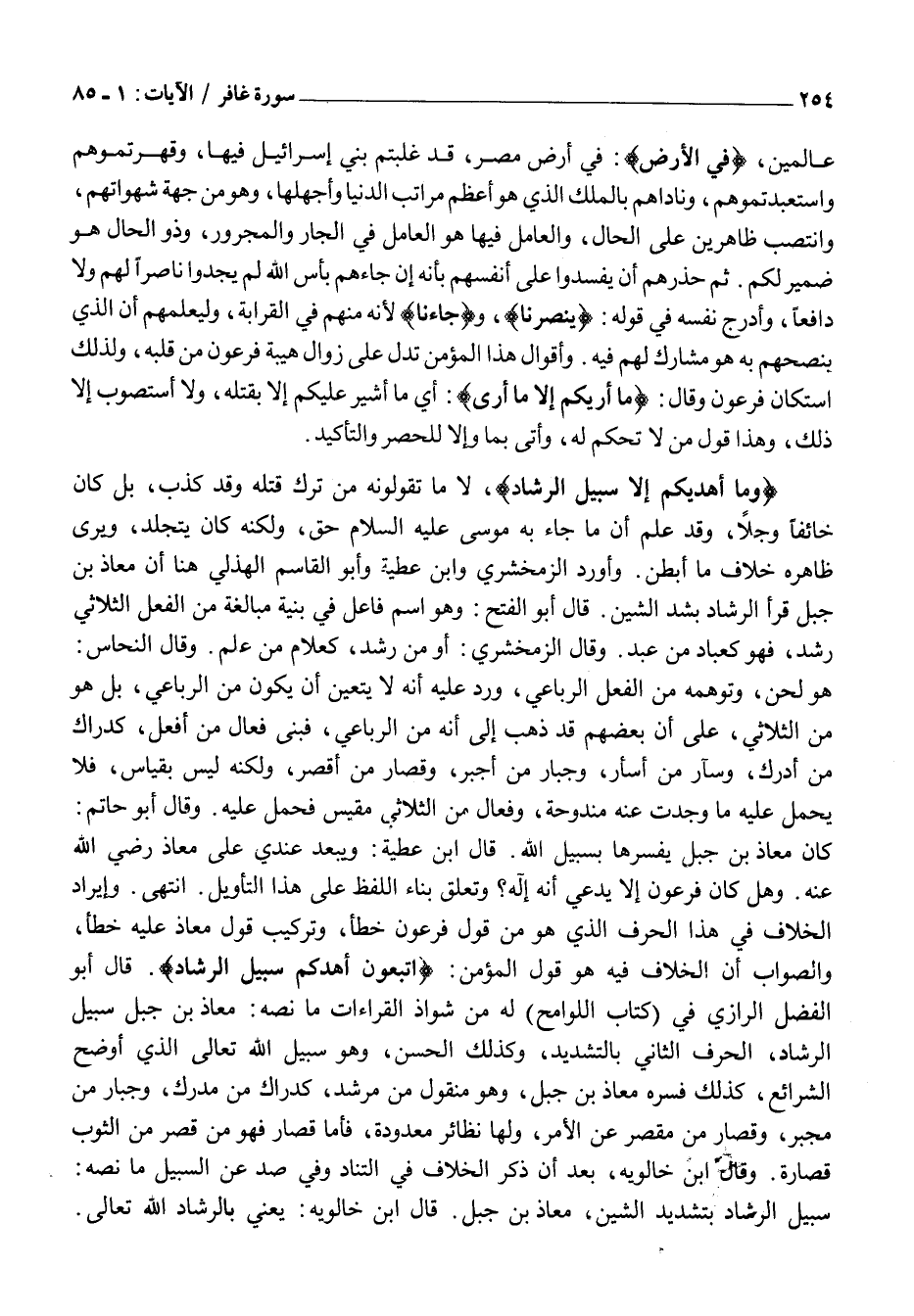 كَانَ مُعَاذُ بْنُ جَبَلٍ يُفَسِّرُهَا بِسَبِيلِ اللَّهِ. قَالَ ابْنُ عَطِيَّةَ: وَيَبْعُدُ عِنْدِي عَلَى مُعَاذٍ رَضِيَ اللَّهُ عَنْهُ. وَهَلْ كَانَ فِرْعَوْنُ إِلَّا يَدَّعِي أَنَّهُ إِلَهٌ؟ وَتَعَلَّقَ بِنَاءُ اللَّفْظِ عَلَى هَذَا التَّأْوِيلِ. انْتَهَى. وَإِيرَادُ الْخِلَافِ فِي هَذَا الْحَرْفِ الَّذِي هُوَ مِنْ قَوْلِ فِرْعَوْنَ خَطَأٌ، وَتَرْكِيبُ قَوْلُ مُعَاذٍ عَلَيْهِ خَطَأٌ، وَالصَّوَابُ أَنَّ الْخِلَافَ فِيهِ هُوَ قَوْلُ الْمُؤْمِنِ: اتَّبِعُونِ أَهْدِكُمْ سَبِيلَ الرَّشادِ. قَالَ أَبُو الْفَضْلِ الرَّازِيُّ فِي (كِتَابِ اللَّوَامِحِ) لَهُ مِنْ شَوَاذِّ الْقِرَاءَاتِ مَا نَصَّهُ: مُعَاذُ بْنُ جَبَلٍ سَبِيلَ الرَّشَادِ، الْحَرْفُ الثَّانِي بِالتَّشْدِيدِ، وَكَذَلِكَ الْحَسَنُ، وَهُوَ سَبِيلُ اللَّهِ تَعَالَى الَّذِي أَوْضَحَ الشَّرَائِعَ، كَذَلِكَ فَسَّرَهُ مُعَاذُ بْنُ جَبَلٍ، وَهُوَ مَنْقُولٌ مِنْ مُرْشِدٍ، كَدَرَّاكٍ مِنْ مُدْرِكٍ، وَجَبَّارٍ من مجبر، وفصار مِنْ مُقْصِرٍ عَنِ الْأَمْرِ، وَلَهَا نَظَائِرُ مَعْدُودَةٌ، فَأَمَّا قَصَّارٌ فَهُوَ مِنْ قَصَرَ مِنَ الثَّوْبِ قِصَارَةً. وَقَالَ ابْنُ خَالَوَيْهِ، بَعْدَ أَنْ ذَكَرَ الْخِلَافَ فِي التَّنَادِ وَفِي صَدٍّ عَنِ السَّبِيلِ مَا نَصُّهُ: