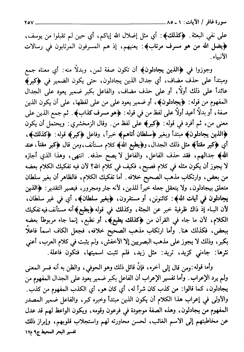 وَجَوَّزُوا فِي الَّذِينَ يُجادِلُونَ أَنْ تَكُونَ صِفَةً لِمَنْ، وَبَدَلًا مِنْهُ: أَيْ مَعْنَاهُ جَمْعٌ وَمُبْتَدَأٌ عَلَى حَذْفِ مُضَافٍ، أَيْ جِدَالُ الَّذِينَ يُجَادِلُونَ، حَتَّى يَكُونَ الضَّمِيرُ فِي كَبُرَ عَائِدًا عَلَى ذَلِكَ أَوَّلًا، أَوْ عَلَى حَذْفِ مُضَافٍ، والفاعل بكبر ضَمِيرٌ يَعُودُ عَلَى الْجِدَالِ الْمَفْهُومِ مِنْ قَوْلِهِ: يُجادِلُونَ، أَوْ ضَمِيرٌ يَعُودُ عَلَى مَنْ عَلَى لَفْظِهَا، عَلَى أَنْ يَكُونَ الَّذِينَ صِفَةً، أَوْ بَدَلًا أُعِيدَ أَوَّلًا عَلَى لَفْظِ مَنْ فِي قَوْلِهِ: هُوَ مُسْرِفٌ كَذَّابٌ. ثُمَّ جَمَعَ الَّذِينَ عَلَى مَعْنَى مَنْ، ثُمَّ أَفْرَدَ فِي قَوْلِهِ: كَبُرَ عَلَى لَفْظِ مَنْ. وَقَالَ الزَّمَخْشَرِيُّ: وَيُحْتَمَلُ أَنْ يَكُونَ الَّذِينَ يُجادِلُونَ مبتدأ وبغير سُلْطانٍ أَتاهُمْ خَبَرًا، وَفَاعِلُ كَبُرَ قَوْلُهُ: كَذلِكَ، أَيْ كَبُرَ مَقْتاً مِثْلَ ذَلِكَ الجدال، ويَطْبَعُ اللَّهُ كَلَامٌ مُسْتَأْنَفٌ، وَمَنْ قَالَ كَبُرَ مَقْتاً، عِنْدَ اللَّهِ جِدَالُهُمْ، فَقَدْ حَذَفَ الْفَاعِلَ، وَالْفَاعِلُ لَا يَصِحُّ حَذْفُهُ. انْتَهَى، وَهَذَا الَّذِي أَجَازَهُ لَا يَجُوزُ أَنْ يَكُونَ مِثْلُهُ فِي كَلَامٍ فَصِيحٍ، فَكَيْفَ فِي كَلَامِ اللَّهِ؟ لِأَنَّ فِيهِ تَفْكِيكَ الْكَلَامِ بَعْضِهِ مِنْ بَعْضٍ، وَارْتِكَابُ مَذْهَبِ الصَّحِيحِ خِلَافُهُ. أَمَّا تَفْكِيكُ الْكَلَامِ، فَالظَّاهِرُ أَنَّ بِغَيْرِ سُلْطَانٍ مُتَعَلِّقٌ بيجادلون، ولا يتعقل جعله خيرا لِلَّذِينِ، لِأَنَّهُ جَارٌّ وَمَجْرُورٌ، فَيَصِيرُ التَّقْدِيرُ: الَّذِينَ يُجادِلُونَ فِي آياتِ اللَّهِ: كائنونن، أَوْ مُسْتَقِرُّونَ، بِغَيْرِ سُلْطانٍ، أَيْ فِي غَيْرِ سُلْطَانٍ، لأن الباء إذ ذَاكَ ظَرْفِيَّةٌ خَبَرٌ عَنِ الْجُثَّةِ، وَكَذَلِكَ فِي قَوْلِهِ يَطْبَعُ أَنَّهُ مُسْتَأْنَفٌ فِيهِ تَفْكِيكُ الْكَلَامِ، لِأَنَّ مَا جَاءَ فِي الْقُرْآنِ مِنْ كَذلِكَ يَطْبَعُ، أَوْ نَطْبَعُ، إِنَّمَا جَاءَ مَرْبُوطًا بَعْضُهُ بِبَعْضٍ، فَكَذَلِكَ هُنَا. وَأَمَّا ارْتِكَابُ مَذْهَبِ الصَّحِيحِ خِلَافُهُ، فَجَعَلَ الْكَافَ اسْمًا فَاعِلًا بكبر، وَذَلِكَ لَا يَجُوزُ عَلَى مَذْهَبِ الْبَصْرِيِّينَ إِلَّا الْأَخْفَشَ، وَلَمْ يَثْبُتْ فِي كَلَامِ الْعَرَبِ، أَعْنِي نَثْرَهَا: جَاءَنِي كَزَيْدٍ، تُرِيدُ: مِثْلَ زَيْدٍ، فَلَمْ تَثْبُتِ اسْمِيَّتُهَا، فَتَكُونُ فَاعِلَةً.