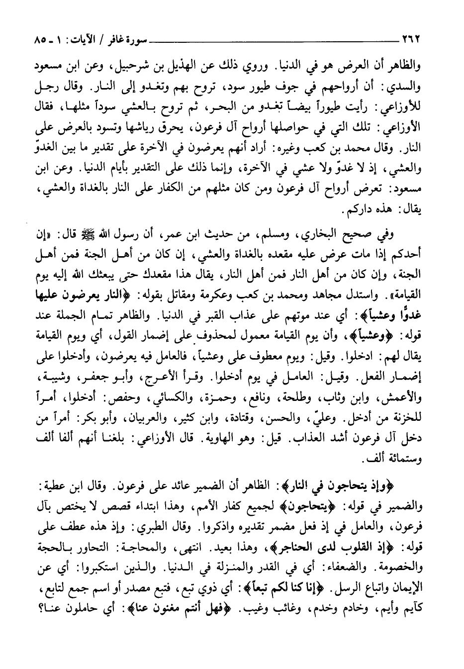 وَالظَّاهِرُ أَنَّ الْعَرْضَ هُوَ فِي الدُّنْيَا. وَرُوِيَ ذَلِكَ عَنِ الْهُذَيْلِ بْنِ شُرَحْبِيلَ، وَعَنِ ابْنِ مَسْعُودٍ وَالسُّدِّيِّ: أَنَّ أَرْوَاحَهُمْ فِي جَوْفِ طُيُورٍ سُودٍ، تَرُوحُ بِهِمْ وَتَغْدُو إِلَى النَّارِ. وَقَالَ رَجُلٌ لِلْأَوْزَاعِيِّ: رَأَيْتُ طُيُورًا بِيضًا تَغْدُو مِنَ الْبَحْرِ، ثُمَّ تَرُوحُ بِالْعَشِيِّ سُودًا مِثْلُهَا، فَقَالَ الْأَوْزَاعِيُّ: تِلْكَ الَّتِي فِي حَوَاصِلِهَا أَرْوَاحُ آلِ فِرْعَوْنَ، يُحْرَقُ رِيَاشُهَا وَتَسْوَدُّ بِالْعَرْضِ عَلَى النَّارِ. وَقَالَ مُحَمَّدُ بْنُ كَعْبٍ وَغَيْرُهُ: أَرَادَ أَنَّهُمْ يُعْرَضُونَ فِي الْآخِرَةِ عَلَى تَقْدِيرِ مَا بَيْنَ الْغُدُوِّ وَالْعَشِيِّ، إِذْ لَا غُدُوَّ وَلَا عَشِيَّ فِي الْآخِرَةِ، وَإِنَّمَا ذَلِكَ عَلَى التَّقْدِيرِ بِأَيَّامِ الدُّنْيَا. وَعَنِ ابْنِ مَسْعُودٍ: تُعْرَضُ أَرْوَاحُ آلِ فِرْعَوْنَ وَمَنْ كَانَ مِثْلَهُمْ مِنَ الْكُفَّارِ عَلَى النَّارِ بِالْغَدَاةِ وَالْعَشِيِّ، يُقَالُ: هَذِهِ دَارُكُمْ.
