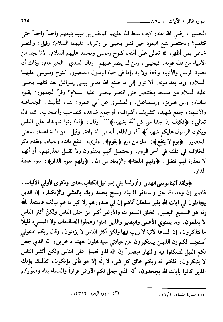 وَلَقَدْ آتَيْنا مُوسَى الْهُدى وَأَوْرَثْنا بَنِي إِسْرائِيلَ الْكِتابَ، هُدىً وَذِكْرى لِأُولِي الْأَلْبابِ، فَاصْبِرْ إِنَّ وَعْدَ اللَّهِ حَقٌّ وَاسْتَغْفِرْ لِذَنْبِكَ وَسَبِّحْ بِحَمْدِ رَبِّكَ بِالْعَشِيِّ وَالْإِبْكارِ، إِنَّ الَّذِينَ يُجادِلُونَ فِي آياتِ اللَّهِ بِغَيْرِ سُلْطانٍ أَتاهُمْ إِنْ فِي صُدُورِهِمْ إِلَّا كِبْرٌ مَا هُمْ بِبالِغِيهِ فَاسْتَعِذْ بِاللَّهِ إِنَّهُ هُوَ السَّمِيعُ الْبَصِيرُ، لَخَلْقُ السَّماواتِ وَالْأَرْضِ أَكْبَرُ مِنْ خَلْقِ النَّاسِ وَلكِنَّ أَكْثَرَ النَّاسِ لَا يَعْلَمُونَ، وَما يَسْتَوِي الْأَعْمى وَالْبَصِيرُ وَالَّذِينَ آمَنُوا وَعَمِلُوا الصَّالِحاتِ وَلَا الْمُسِيءُ قَلِيلًا مَا تَتَذَكَّرُونَ، إِنَّ السَّاعَةَ لَآتِيَةٌ لَا رَيْبَ فِيها وَلكِنَّ أَكْثَرَ النَّاسِ لَا يُؤْمِنُونَ، وَقالَ رَبُّكُمُ ادْعُونِي أَسْتَجِبْ لَكُمْ إِنَّ الَّذِينَ يَسْتَكْبِرُونَ عَنْ عِبادَتِي سَيَدْخُلُونَ جَهَنَّمَ داخِرِينَ، اللَّهُ الَّذِي جَعَلَ لَكُمُ اللَّيْلَ لِتَسْكُنُوا فِيهِ وَالنَّهارَ مُبْصِراً إِنَّ اللَّهَ لَذُو فَضْلٍ عَلَى النَّاسِ وَلكِنَّ أَكْثَرَ النَّاسِ لَا يَشْكُرُونَ، ذلِكُمُ اللَّهُ رَبُّكُمْ خالِقُ كُلِّ شَيْءٍ لَا إِلهَ إِلَّا هُوَ فَأَنَّى تُؤْفَكُونَ، كَذلِكَ يُؤْفَكُ الَّذِينَ كانُوا بِآياتِ اللَّهِ يَجْحَدُونَ، اللَّهُ الَّذِي جَعَلَ لَكُمُ الْأَرْضَ قَراراً وَالسَّماءَ بِناءً وَصَوَّرَكُمْ