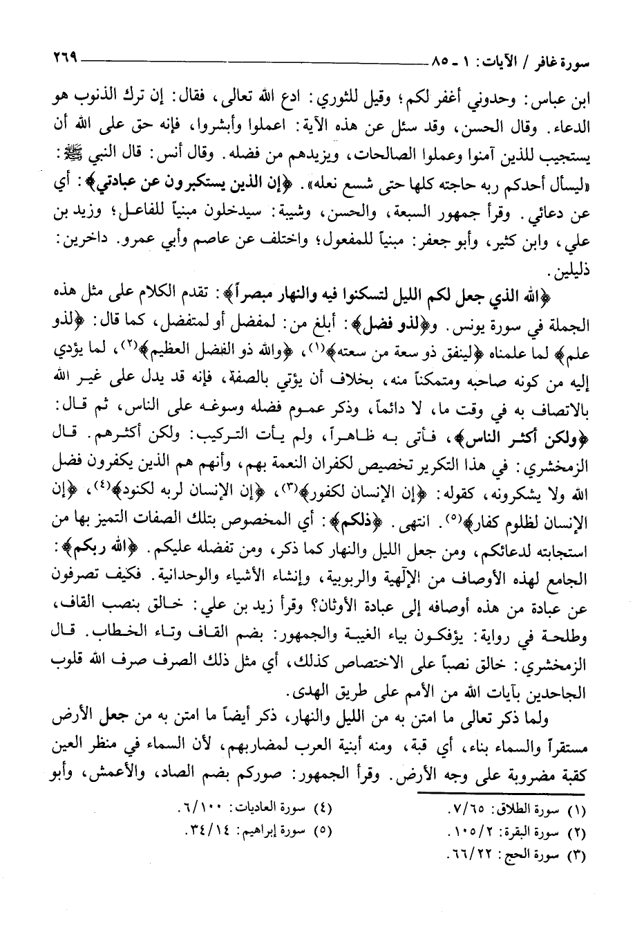 وَلكِنَّ أَكْثَرَ النَّاسِ، فَأَتَى بِهِ ظَاهِرًا، وَلَمْ يَأْتِ التَّرْكِيبُ: وَلَكِنَّ أَكْثَرَهُمْ. قَالَ الزَّمَخْشَرِيُّ: فِي هَذَا التَّكْرِيرِ تَخْصِيصٌ لِكُفْرَانِ النِّعْمَةِ بِهِمْ، وَأَنَّهُمْ هُمُ الَّذِينَ يَكْفُرُونَ فَضْلَ اللَّهِ وَلَا يَشْكُرُونَهُ، كَقَوْلِهِ: إِنَّ الْإِنْسانَ لَكَفُورٌ «3» ، إِنَّ الْإِنْسانَ لِرَبِّهِ لَكَنُودٌ «4» ، إِنَّ الْإِنْسانَ لَظَلُومٌ كَفَّارٌ «5» . انْتَهَى. ذلِكُمُ: أَيِ الْمَخْصُوصُ بِتِلْكَ الصِّفَاتِ التميز بِهَا مِنَ اسْتَجَابَتِهِ لِدُعَائِكُمْ، وَمِنْ جَعْلِ اللَّيْلِ وَالنَّهَارِ كَمَا ذَكَرَ، وَمِنْ تَفَضُّلِهِ عَلَيْكُمْ. اللَّهُ رَبُّكُمْ: