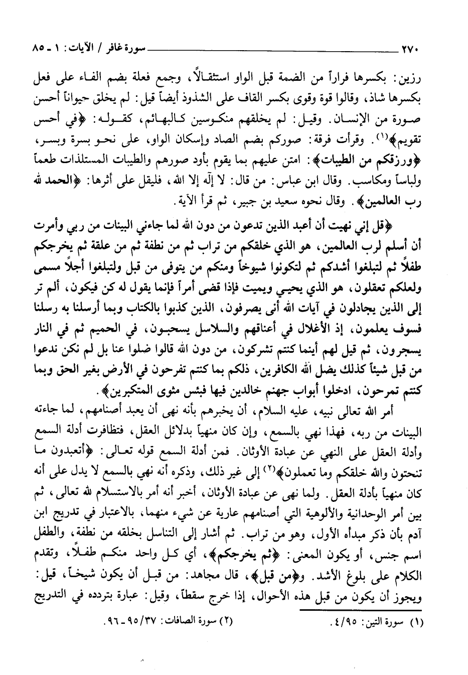 قُلْ إِنِّي نُهِيتُ أَنْ أَعْبُدَ الَّذِينَ تَدْعُونَ مِنْ دُونِ اللَّهِ لَمَّا جاءَنِي الْبَيِّناتُ مِنْ رَبِّي وَأُمِرْتُ أَنْ أُسْلِمَ لِرَبِّ الْعالَمِينَ، هُوَ الَّذِي خَلَقَكُمْ مِنْ تُرابٍ ثُمَّ مِنْ نُطْفَةٍ ثُمَّ مِنْ عَلَقَةٍ ثُمَّ يُخْرِجُكُمْ طِفْلًا ثُمَّ لِتَبْلُغُوا أَشُدَّكُمْ ثُمَّ لِتَكُونُوا شُيُوخاً وَمِنْكُمْ مَنْ يُتَوَفَّى مِنْ قَبْلُ وَلِتَبْلُغُوا أَجَلًا مُسَمًّى وَلَعَلَّكُمْ تَعْقِلُونَ، هُوَ الَّذِي يُحْيِي وَيُمِيتُ فَإِذا قَضى أَمْراً فَإِنَّما يَقُولُ لَهُ كُنْ فَيَكُونُ، أَلَمْ تَرَ إِلَى الَّذِينَ يُجادِلُونَ فِي آياتِ اللَّهِ أَنَّى يُصْرَفُونَ، الَّذِينَ كَذَّبُوا بِالْكِتابِ وَبِما أَرْسَلْنا بِهِ رُسُلَنا فَسَوْفَ يَعْلَمُونَ، إِذِ الْأَغْلالُ فِي أَعْناقِهِمْ وَالسَّلاسِلُ يُسْحَبُونَ، فِي الْحَمِيمِ ثُمَّ فِي النَّارِ يُسْجَرُونَ، ثُمَّ قِيلَ لَهُمْ أَيْنَ مَا كُنْتُمْ تُشْرِكُونَ، مِنْ دُونِ اللَّهِ قالُوا ضَلُّوا عَنَّا بَلْ لَمْ نَكُنْ نَدْعُوا مِنْ قَبْلُ شَيْئاً كَذلِكَ يُضِلُّ اللَّهُ الْكافِرِينَ، ذلِكُمْ بِما كُنْتُمْ تَفْرَحُونَ فِي الْأَرْضِ بِغَيْرِ الْحَقِّ وَبِما كُنْتُمْ تَمْرَحُونَ، ادْخُلُوا أَبْوابَ جَهَنَّمَ خالِدِينَ فِيها فَبِئْسَ مَثْوَى الْمُتَكَبِّرِينَ.
