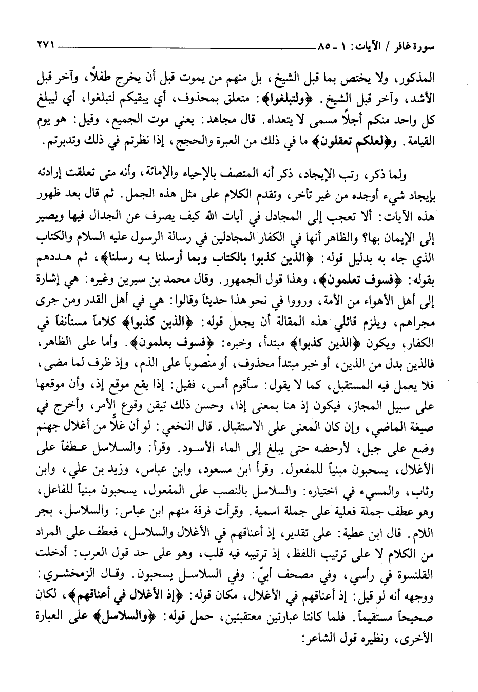 وَلَمَّا ذَكَرَ، رُتَبَ الْإِيجَادِ، ذَكَرَ أَنَّهُ الْمُتَّصِفُ بِالْإِحْيَاءِ وَالْإِمَاتَةِ، وَأَنَّهُ مَتَى تَعَلَّقَتْ إِرَادَتُهُ بِإِيجَادِ شَيْءٍ أَوْجَدَهُ مِنْ غَيْرِ تَأَخُّرٍ، وَتَقَدَّمَ الْكَلَامُ عَلَى مِثْلِ هَذِهِ الْجُمَلِ. ثُمَّ قَالَ بَعْدَ ظُهُورِ هَذِهِ الْآيَاتِ: أَلَا تَعْجَبُ إِلَى الْمُجَادِلِ فِي آيات الله كيف يصرف عن الجدال فيها ويصير إلى الإيمان بها؟ والظاهر أنها في الكفار المجادلين فِي رِسَالَةِ الرَّسُولِ عَلَيْهِ السَّلَامُ وَالْكِتَابِ الَّذِي جَاءَ بِهِ بِدَلِيلِ قَوْلِهِ: الَّذِينَ كَذَّبُوا بِالْكِتابِ وَبِما أَرْسَلْنا بِهِ رُسُلَنا، ثُمَّ هَدَّدَهُمْ بِقَوْلِهِ: فَسَوْفَ يَعْلَمُونَ، وَهَذَا قَوْلُ الْجُمْهُورِ. وَقَالَ مُحَمَّدُ بْنُ سِيرِينَ وَغَيْرُهُ: هِيَ إِشَارَةٌ إِلَى أَهْلِ الْأَهْوَاءِ مِنَ الْأُمَّةِ، وَرَوَوْا فِي نَحْوِ هَذَا حَدِيثًا وَقَالُوا: هِيَ فِي أَهْلِ الْقَدَرِ وَمَنْ جَرَى مَجْرَاهُمْ، وَيَلْزَمُ قَائِلِي هَذِهِ الْمَقَالَةِ أَنْ يُجْعَلَ قَوْلُهُ: الَّذِينَ كَذَّبُوا كَلَامًا مُسْتَأْنَفًا فِي الْكُفَّارِ، وَيَكُونَ الَّذِينَ كَذَّبُوا مُبْتَدَأً، وَخَبَرُهُ: فَسَوْفَ يَعْلَمُونَ. وَأَمَّا عَلَى الظَّاهِرِ، فَالَّذِينَ بَدَلٌ مِنَ الَّذِينَ، أَوْ خَبَرُ مُبْتَدَأٍ مَحْذُوفٍ، أَوْ مَنْصُوبًا على الذم، وَإِذْ ظَرْفٌ لِمَا مَضَى، فَلَا يَعْمَلُ فِيهِ الْمُسْتَقْبَلُ، كَمَا لَا يَقُولُ: سَأَقُومُ أَمْسُ، فَقِيلَ: إِذَا يَقَعُ مَوْقِعَ إِذْ، وَأَنَّ مَوْقِعَهَا عَلَى سَبِيلِ الْمَجَازِ، فَيَكُونُ إِذْ هُنَا بِمَعْنَى إِذَا، وحسن ذلك تقين وُقُوعِ الْأَمْرِ، وَأُخْرِجَ فِي صِيغَةِ الْمَاضِي، وَإِنْ كَانَ الْمَعْنَى عَلَى الِاسْتِقْبَالِ. قَالَ النَّخَعِيُّ: لَوْ أَنَّ غُلًّا مِنْ أَغْلَالِ جَهَنَّمَ وُضِعَ عَلَى جَبَلٍ، لَأَرْحَضَهُ حَتَّى يَبْلُغَ إِلَى الْمَاءِ الْأَسْوَدِ. وَقَرَأَ: وَالسَّلَاسِلُ عَطْفًا عَلَى الْأَغْلَالُ، يُسْحَبُونَ مَبْنِيًّا لِلْمَفْعُولِ. وَقَرَأَ ابْنُ مَسْعُودٍ، وَابْنُ عَبَّاسٍ، وَزَيْدُ بْنُ عَلِيٍّ، وَابْنُ وَثَّابٍ، وَالْمُسِيءُ فِي اخْتِيَارِهِ: وَالسَّلَاسِلَ بِالنَّصْبِ عَلَى الْمَفْعُولِ، يُسْحَبُونَ مَبْنِيًّا لِلْفَاعِلِ، وَهُوَ عَطَفَ جُمْلَةً فِعْلِيَّةً عَلَى جُمْلَةٍ اسْمِيَّةٍ. وَقَرَأَتْ فَرِقَةٌ مِنْهُمُ ابْنُ عَبَّاسٍ: وَالسَّلَاسِلِ، بِجَرِّ اللَّامِ. قَالَ ابْنُ عَطِيَّةَ: عَلَى تَقْدِيرِ، إِذْ أَعْنَاقُهُمْ فِي الْأَغْلَالِ وَالسَّلَاسِلِ، فَعَطَفَ عَلَى الْمُرَادِ مِنَ الْكَلَامِ لَا عَلَى تَرْتِيبِ اللَّفْظِ، إِذْ تَرْتِيبُهُ فِيهِ قَلْبٌ، وَهُوَ عَلَى حَدِّ قَوْلِ الْعَرَبُ: أَدْخَلْتُ الْقَلَنْسُوَةَ فِي رَأْسِي، وَفِي مُصْحَفِ أُبَيٍّ: وَفِي السَّلَاسِلِ يُسْحَبُونَ. وَقَالَ الزَّمَخْشَرِيُّ:
