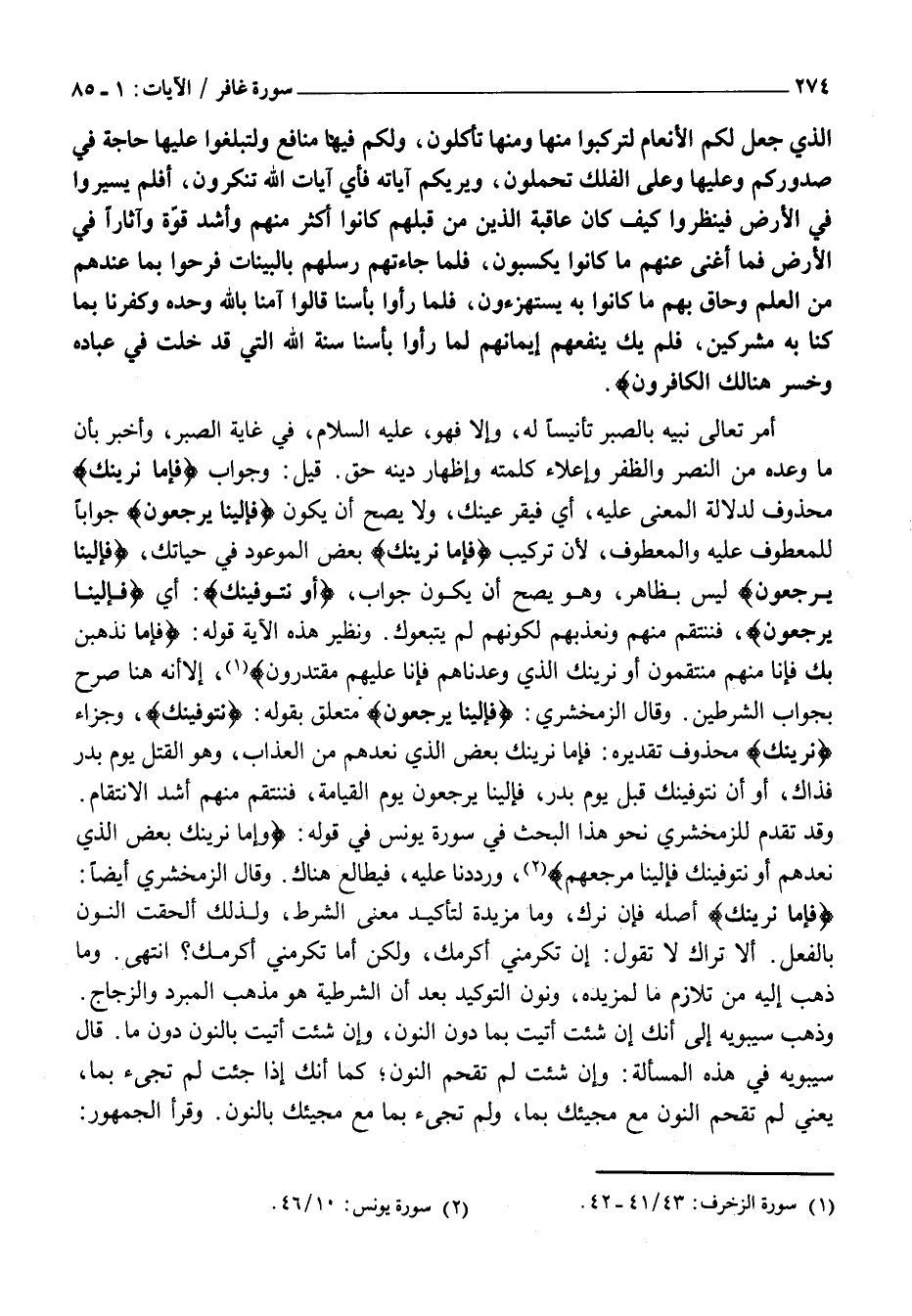 الَّذِي جَعَلَ لَكُمُ الْأَنْعامَ لِتَرْكَبُوا مِنْها وَمِنْها تَأْكُلُونَ، وَلَكُمْ فِيها مَنافِعُ وَلِتَبْلُغُوا عَلَيْها حاجَةً فِي صُدُورِكُمْ وَعَلَيْها وَعَلَى الْفُلْكِ تُحْمَلُونَ، وَيُرِيكُمْ آياتِهِ فَأَيَّ آياتِ اللَّهِ تُنْكِرُونَ، أَفَلَمْ يَسِيرُوا فِي الْأَرْضِ فَيَنْظُرُوا كَيْفَ كانَ عاقِبَةُ الَّذِينَ مِنْ قَبْلِهِمْ كانُوا أَكْثَرَ مِنْهُمْ وَأَشَدَّ قُوَّةً وَآثاراً فِي الْأَرْضِ فَما أَغْنى عَنْهُمْ مَا كانُوا يَكْسِبُونَ، فَلَمَّا جاءَتْهُمْ رُسُلُهُمْ بِالْبَيِّناتِ فَرِحُوا بِما عِنْدَهُمْ مِنَ الْعِلْمِ وَحاقَ بِهِمْ مَا كانُوا بِهِ يَسْتَهْزِؤُنَ، فَلَمَّا رَأَوْا بَأْسَنا قالُوا آمَنَّا بِاللَّهِ وَحْدَهُ وَكَفَرْنا بِما كُنَّا بِهِ مُشْرِكِينَ، فَلَمْ يَكُ يَنْفَعُهُمْ إِيمانُهُمْ لَمَّا رَأَوْا بَأْسَنا سُنَّتَ اللَّهِ الَّتِي قَدْ خَلَتْ فِي عِبادِهِ وَخَسِرَ هُنالِكَ الْكافِرُونَ.