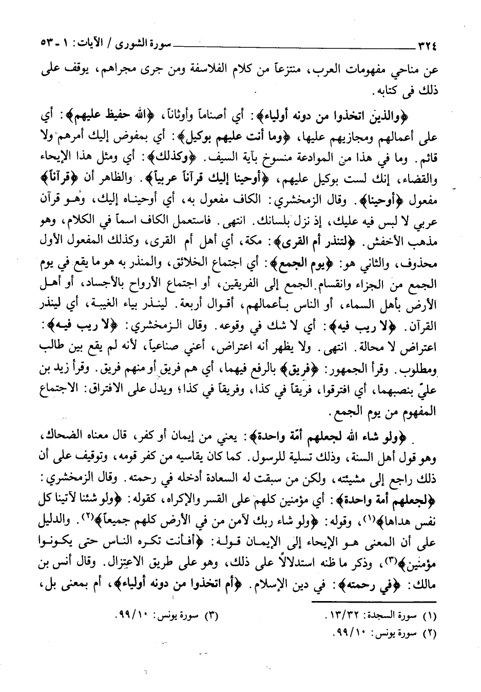 وَالَّذِينَ اتَّخَذُوا مِنْ دُونِهِ أَوْلِياءَ: أَيْ أَصْنَامًا وَأَوْثَانًا، اللَّهُ حَفِيظٌ عَلَيْهِمْ: أَيْ عَلَى أَعْمَالِهِمْ وَمُجَازِيهِمْ عَلَيْهَا، وَما أَنْتَ عَلَيْهِمْ بِوَكِيلٍ: أَيْ بِمُفَوَّضٍ إِلَيْكَ أَمْرُهُمْ وَلَا قَائِمٍ. وَمَا فِي هَذَا مِنَ الْمُوَادَعَةِ مَنْسُوخٌ بِآيَةِ السَّيْفِ. وَكَذلِكَ: أَيْ وَمِثْلُ هَذَا الْإِيحَاءِ وَالْقَضَاءِ، إِنَّكَ لَسْتَ بِوَكِيلٍ عَلَيْهِمْ، أَوْحَيْنا إِلَيْكَ قُرْآناً عَرَبِيًّا. والظاهر أن قُرْآناً مَفْعُولُ أَوْحَيْنا. وَقَالَ الزَّمَخْشَرِيُّ: الْكَافُ مَفْعُولٌ بِهِ، أَيْ أَوْحَيْنَاهُ إِلَيْكَ، وَهُوَ قُرْآنٌ عَرَبِيٌّ لَا لَبْسَ فِيهِ عَلَيْكَ، إِذْ نَزَلَ بِلِسَانِكَ. انْتَهَى. فَاسْتَعْمَلَ الْكَافَ اسْمًا فِي الْكَلَامِ، وَهُوَ مَذْهَبُ الْأَخْفَشِ. لِتُنْذِرَ أُمَّ الْقُرى: مَكَّةَ، أَيْ أَهْلَ أُمِّ الْقُرَى، وَكَذَلِكَ الْمَفْعُولُ الْأَوَّلُ مَحْذُوفٌ، وَالثَّانِي هُوَ: يَوْمَ الْجَمْعِ: أَيِ اجْتِمَاعِ الْخَلَائِقِ، وَالْمُنْذَرُ بِهِ هُوَ مَا يَقَعُ فِي يَوْمِ الْجَمْعِ مِنَ الْجَزَاءِ وَانْقِسَامِ الْجَمْعِ إِلَى الْفَرِيقَيْنِ، أَوِ اجْتِمَاعِ الْأَرْوَاحِ بِالْأَجْسَادِ، أَوْ أَهْلِ الْأَرْضِ بِأَهْلِ السَّمَاءِ، أَوِ النَّاسِ بِأَعْمَالِهِمْ، أَقْوَالٌ أَرْبَعَةٌ. لِيُنْذِرَ بِيَاءِ الْغَيْبَةِ، أَيْ لِيُنْذِرَ الْقُرْآنُ. لَا رَيْبَ فِيهِ: أَيْ لَا شَكَّ فِي وُقُوعِهِ. وَقَالَ الزَّمَخْشَرِيُّ: لَا رَيْبَ فِيهِ: