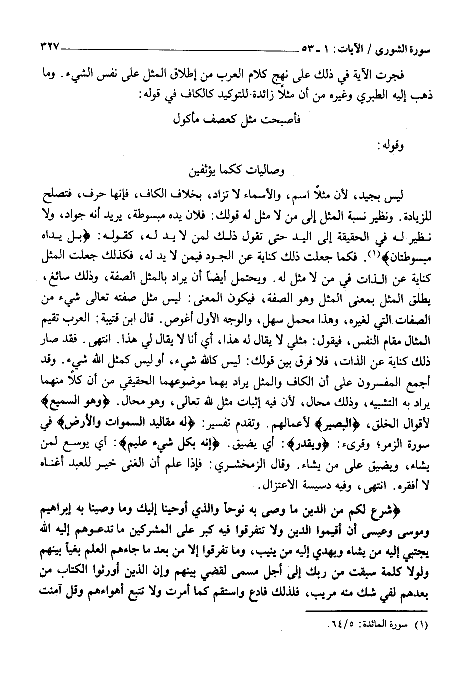 فَجَرَتِ الْآيَةُ فِي ذَلِكَ عَلَى نَهْجِ كَلَامِ الْعَرَبِ مِنْ إِطْلَاقِ الْمِثْلِ عَلَى نَفْسِ الشَّيْءِ. وَمَا ذَهَبَ إِلَيْهِ الطَّبَرِيُّ وَغَيْرُهُ مِنْ أَنَّ مِثْلًا زَائِدَةٌ لِلتَّوْكِيدِ كَالْكَافِّ فِي قَوْلِهِ: