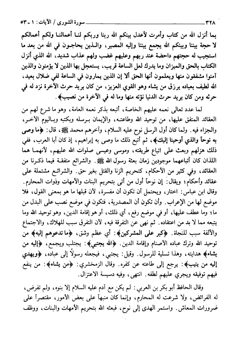 لَمَّا عَدَّدَ تَعَالَى نِعَمَهُ عَلَيْهِمْ الْخَاصَّةَ، أَتْبَعَهُ بِذِكْرِ نِعَمِهِ الْعَامَّةِ، وَهُوَ مَا شَرَعَ لَهُمْ مِنَ الْعَقَائِدِ الْمُتَّفَقِ عَلَيْهَا، مِنْ تَوْحِيدِ اللَّهِ وَطَاعَتِهِ، وَالْإِيمَانِ بِرُسُلِهِ وَبِكُتُبِهِ وَبِالْيَوْمِ الْآخِرِ، وَالْجَزَاءِ فِيهِ. وَلَمَّا كَانَ أَوَّلَ الرُّسُلِ نُوحٌ عَلَيْهِ السَّلَامُ، وَآخِرَهُمْ مُحَمَّدٌ صَلَّى اللَّهُ عَلَيْهِ وَسَلَّمَ، قَالَ: مَا وَصَّى بِهِ نُوحاً وَالَّذِي أَوْحَيْنا إِلَيْكَ، ثُمَّ أَتْبَعَ ذَلِكَ مَا وَصَّى بِهِ إِبْرَاهِيمَ، إِذْ كَانَ أَبَا الْعَرَبِ، فَفِي ذَلِكَ هَزْلُهُمْ وَبَعْثٌ عَلَى اتِّبَاعِ طَرِيقَتِهِ، وَمُوسَى وَعِيسَى صَلَوَاتُ اللَّهِ عَلَيْهِمْ، لِأَنَّهُمَا هُمَا اللَّذَانِ كَانَ أَتْبَاعُهُمَا مَوْجُودِينَ زَمَانَ بعثة رسول الله صلى اللَّهُ عَلَيْهِ وَسَلَّمَ. وَالشَّرَائِعُ مُتَّفِقَةٌ فِيمَا ذَكَرْنَا مِنَ الْعَقَائِدِ، وَفِي كَثِيرٍ مِنَ الْأَحْكَامِ، كَتَحْرِيمِ الزِّنَا وَالْقَتْلِ بِغَيْرِ حَقٍّ. وَالشَّرَائِعُ مُشْتَمِلَةٌ عَلَى عَقَائِدَ وَأَحْكَامٍ وَيُقَالُ: إِنَّ نُوحًا أَوَّلُ مَنْ أَتَى بِتَحْرِيمِ الْبَنَاتِ وَالْأُمَّهَاتِ وَذَوَاتِ الْمَحَارِمِ.