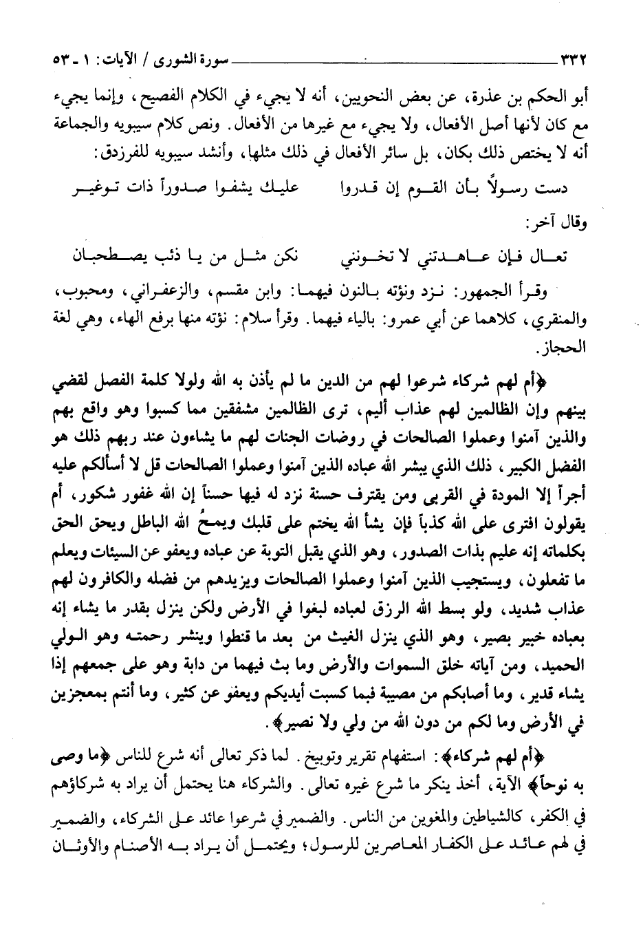 أَمْ لَهُمْ شُرَكاءُ شَرَعُوا لَهُمْ مِنَ الدِّينِ مَا لَمْ يَأْذَنْ بِهِ اللَّهُ وَلَوْلا كَلِمَةُ الْفَصْلِ لَقُضِيَ بَيْنَهُمْ وَإِنَّ الظَّالِمِينَ لَهُمْ عَذابٌ أَلِيمٌ، تَرَى الظَّالِمِينَ مُشْفِقِينَ مِمَّا كَسَبُوا وَهُوَ واقِعٌ بِهِمْ وَالَّذِينَ آمَنُوا وَعَمِلُوا الصَّالِحاتِ فِي رَوْضاتِ الْجَنَّاتِ لَهُمْ ما يَشاؤُنَ عِنْدَ رَبِّهِمْ ذلِكَ هُوَ الْفَضْلُ الْكَبِيرُ، ذلِكَ الَّذِي يُبَشِّرُ اللَّهُ عِبادَهُ الَّذِينَ آمَنُوا وَعَمِلُوا الصَّالِحاتِ قُلْ لا أَسْئَلُكُمْ عَلَيْهِ أَجْراً إِلَّا الْمَوَدَّةَ فِي الْقُرْبى وَمَنْ يَقْتَرِفْ حَسَنَةً نَزِدْ لَهُ فِيها حُسْناً إِنَّ اللَّهَ غَفُورٌ شَكُورٌ، أَمْ يَقُولُونَ افْتَرى عَلَى اللَّهِ كَذِباً فَإِنْ يَشَإِ اللَّهُ يَخْتِمْ عَلى قَلْبِكَ وَيَمْحُ اللَّهُ الْباطِلَ وَيُحِقُّ الْحَقَّ بِكَلِماتِهِ إِنَّهُ عَلِيمٌ بِذاتِ الصُّدُورِ، وَهُوَ الَّذِي يَقْبَلُ التَّوْبَةَ عَنْ عِبادِهِ وَيَعْفُوا عَنِ السَّيِّئاتِ وَيَعْلَمُ مَا تَفْعَلُونَ، وَيَسْتَجِيبُ الَّذِينَ آمَنُوا وَعَمِلُوا الصَّالِحاتِ وَيَزِيدُهُمْ مِنْ فَضْلِهِ وَالْكافِرُونَ لَهُمْ عَذابٌ شَدِيدٌ، وَلَوْ بَسَطَ اللَّهُ الرِّزْقَ لِعِبادِهِ لَبَغَوْا فِي الْأَرْضِ وَلكِنْ يُنَزِّلُ بِقَدَرٍ مَا يَشاءُ إِنَّهُ بِعِبادِهِ خَبِيرٌ بَصِيرٌ، وَهُوَ الَّذِي يُنَزِّلُ الْغَيْثَ مِنْ بَعْدِ مَا قَنَطُوا وَيَنْشُرُ رَحْمَتَهُ وَهُوَ الْوَلِيُّ الْحَمِيدُ، وَمِنْ آياتِهِ خَلْقُ السَّماواتِ وَالْأَرْضِ وَما بَثَّ فِيهِما مِنْ دابَّةٍ وَهُوَ عَلى جَمْعِهِمْ إِذا يَشاءُ قَدِيرٌ، وَما أَصابَكُمْ مِنْ مُصِيبَةٍ فَبِما كَسَبَتْ أَيْدِيكُمْ وَيَعْفُوا عَنْ كَثِيرٍ، وَما أَنْتُمْ بِمُعْجِزِينَ فِي الْأَرْضِ وَما لَكُمْ مِنْ دُونِ اللَّهِ مِنْ وَلِيٍّ وَلا نَصِيرٍ.